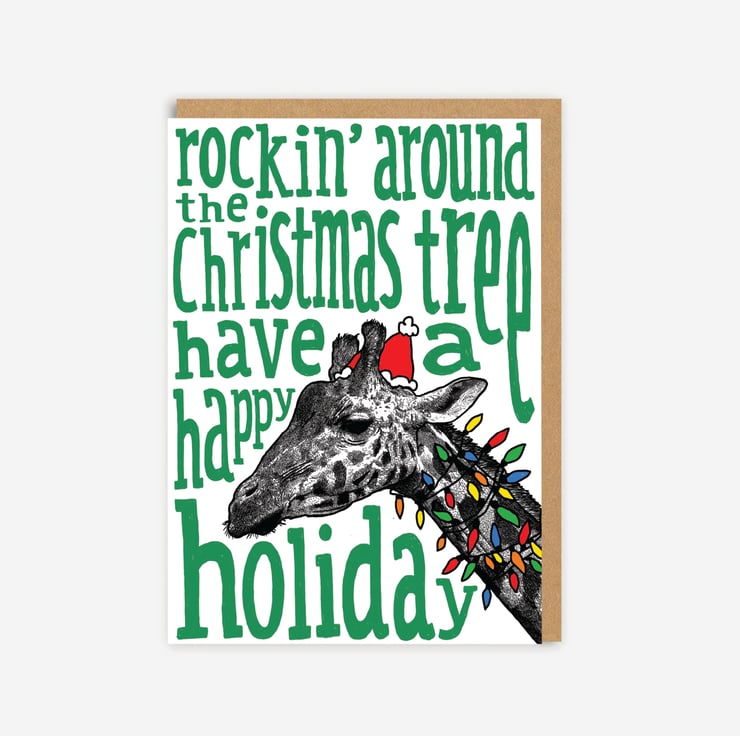 This giraffe looks like he's had a good time at the office Christmas party, feeling the Home Alone vibes with this "Rockin' around the Christmas tree" Christmas card.