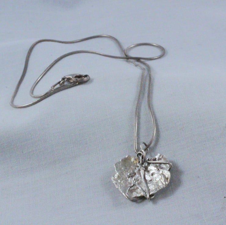 A small silver pendant cast in silver clay from a natural Anomia shell, it has fine silver wire wrapped around it to create a hanging loop and cage to hold the shell. It hangs from a re-used snake chain approximately 45cm long.