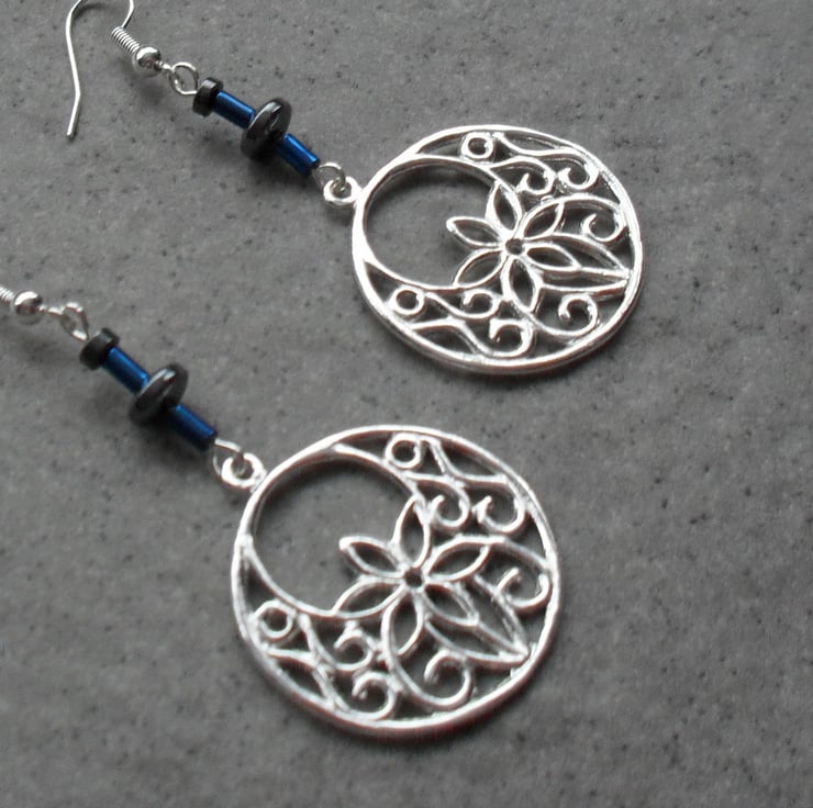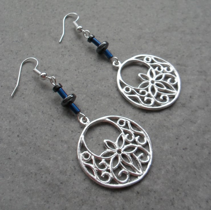 Silver plated discs with a flower pattern design, blue coated haematite and gunmetal grey haematite are attached to silver plated ear wires