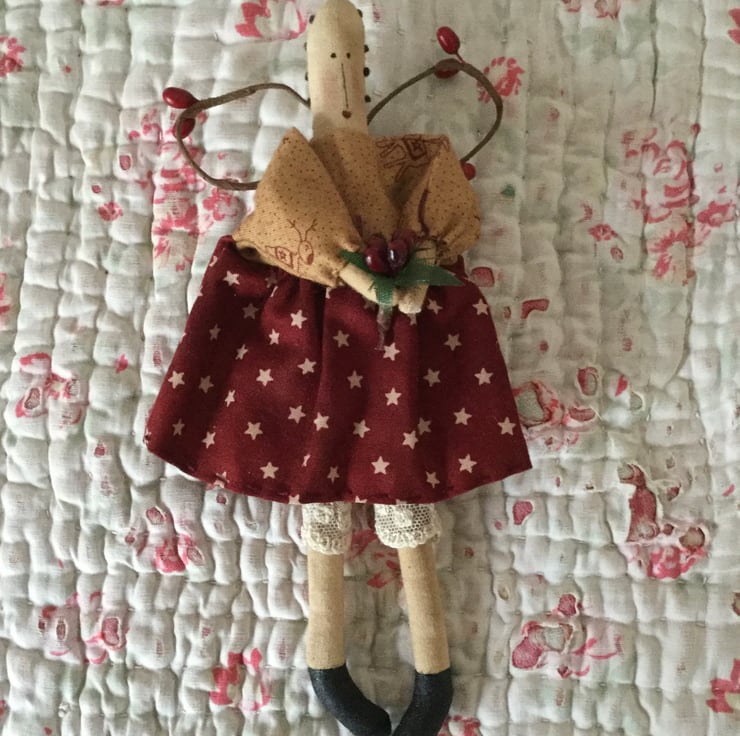 This miniature homespun angel is approx 20cm long, The body is made from tea stained cotton. She is wearing bloomers made from vintage lace and her dress is made from two printed homespun fabrics, finished off with cuff ties.