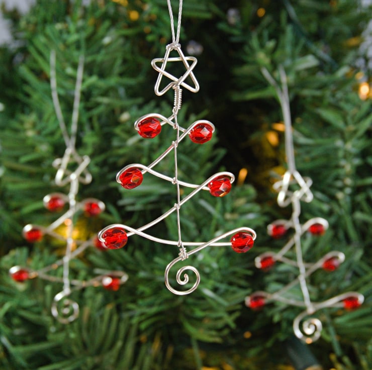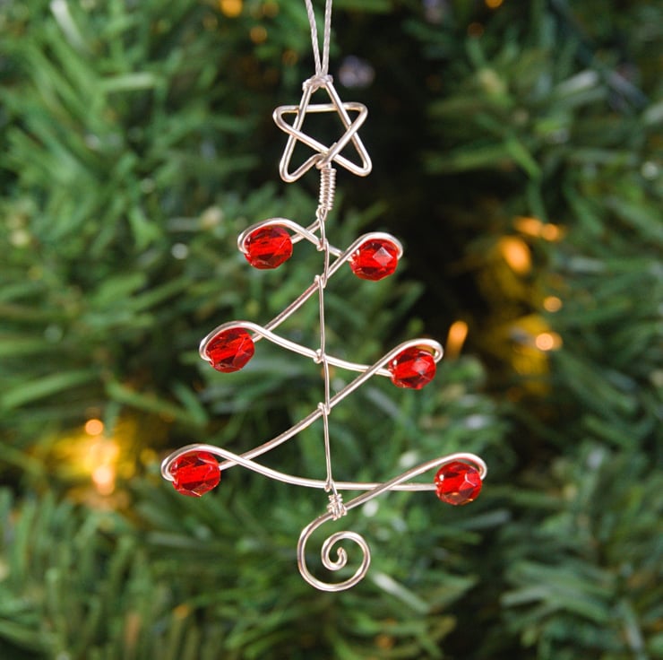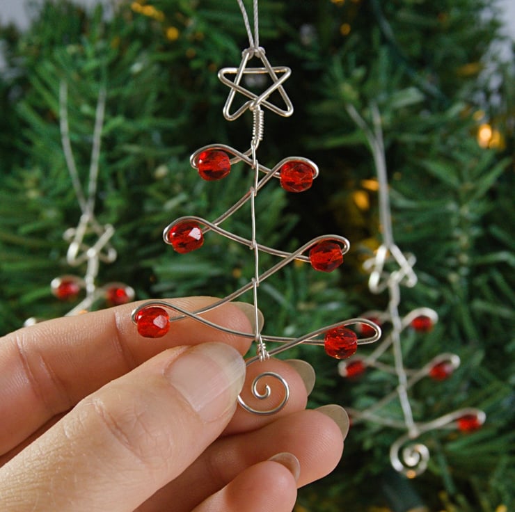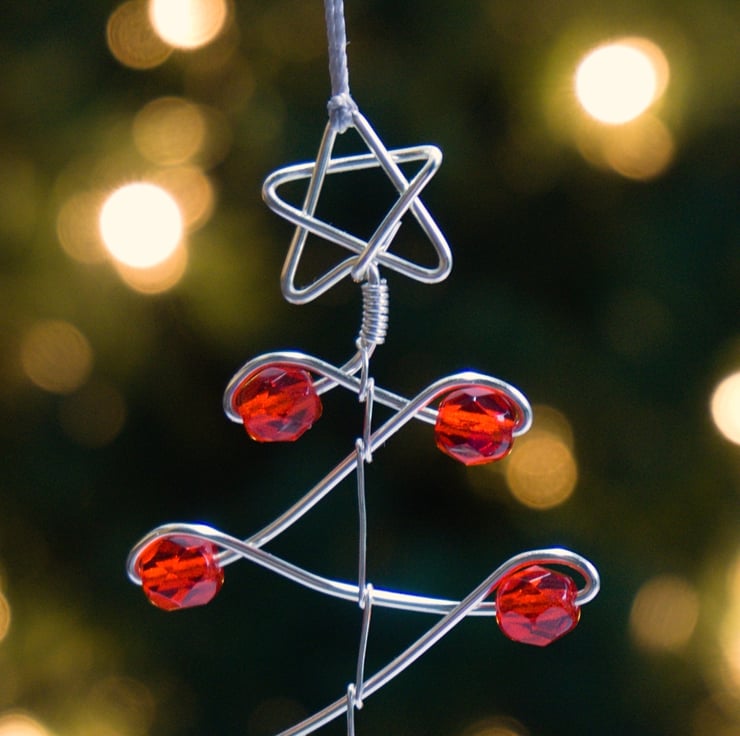 These gorgeous little Christmas Tree decorations have been completely handmade from silver plated copper wire. The tree shape is formed by looping wire back & forth, with a faceted bead inside each loop to represent the baubles. I've bent the wire into a little star for the top of the tree & then a small spiral for the base. The facets on the glass beads along with the shiny non-tarnish wire, mean these little trees really sparkle...especially next to some fairy lights!