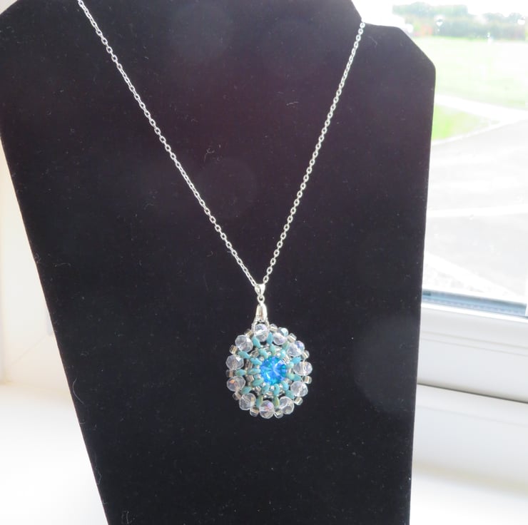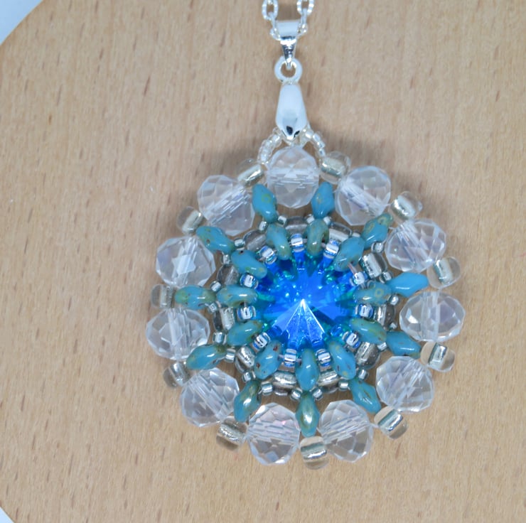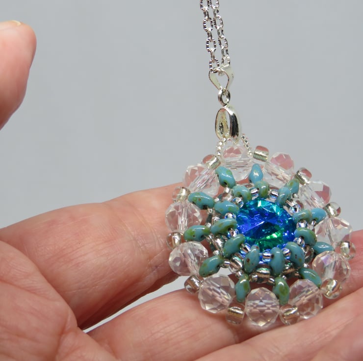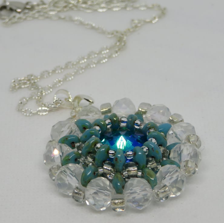 A stunning turquoise rivoli is the centrepiece of this pendant. It is surrounded by beadwork, using turquoise picasso superduo beads, clear crystal miyuki seed beads and crystal rondelles. It hangs from an elegant silver plated bail and silver plated textured chain with a simple lobster clasp fastening.