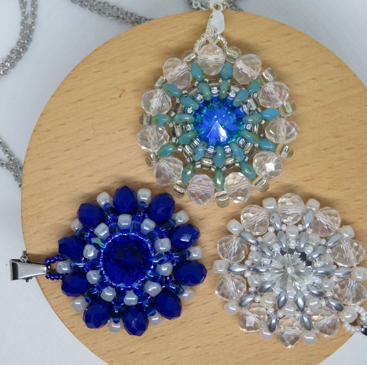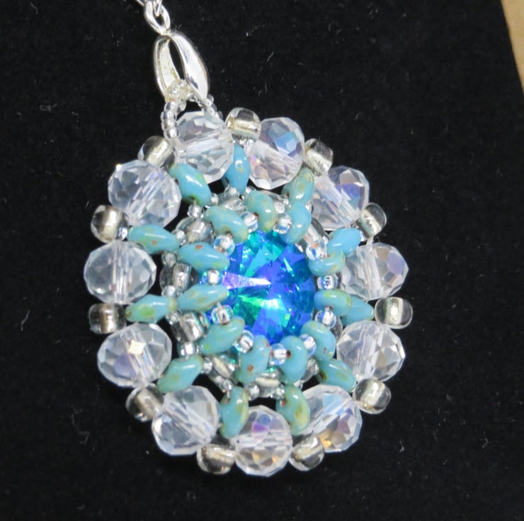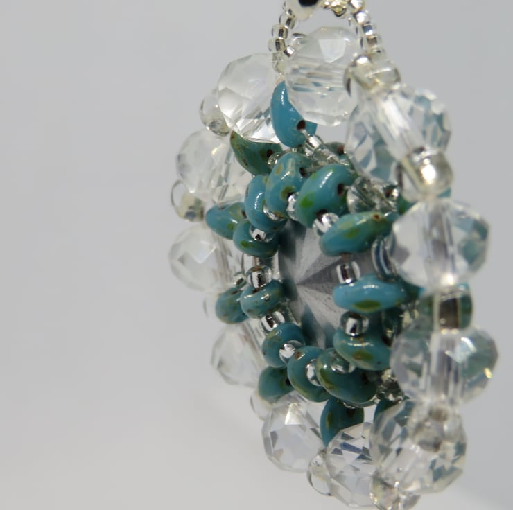 This is a variation on a design by Monika Wojdyla, so huge thanks to her. In this version, the slightly muted shades of the superduo beads and the clear crystals really help to draw out the deep turquoise of the central rivoli. Also shown are the Blue Lagoon and Crystal Charisma Pendants.