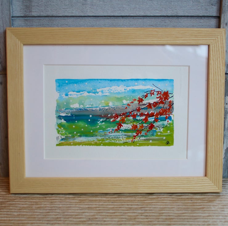 I produced this little painting of an acer branch in front of a landscape using watercolour, ink and gouache. Framed in ash and Plexiglas-glass the product measures 26cm x 18cm in total and makes a charming addition to any room.