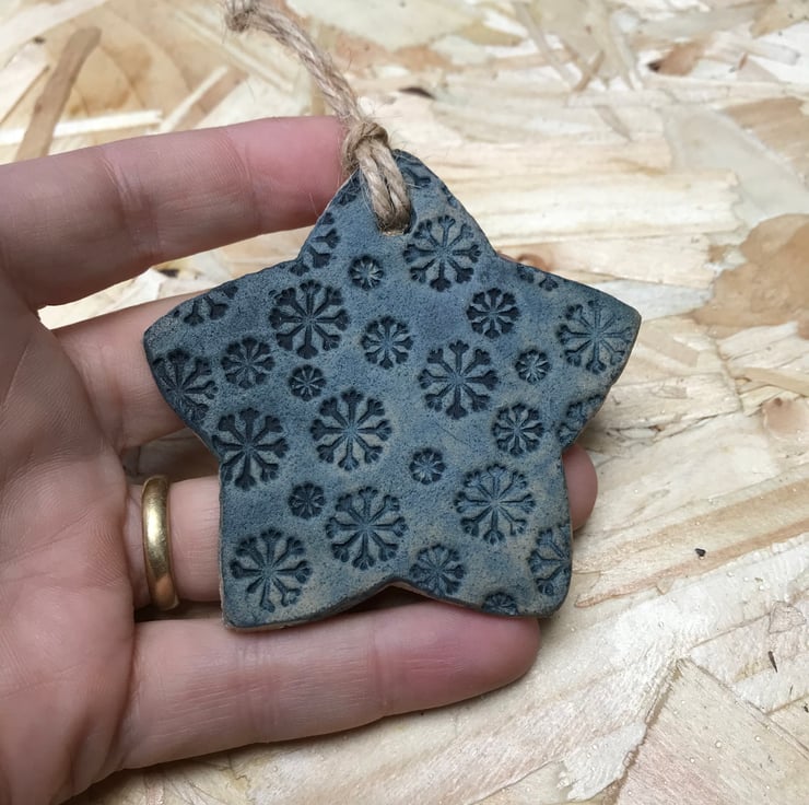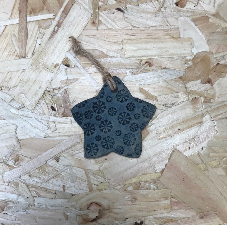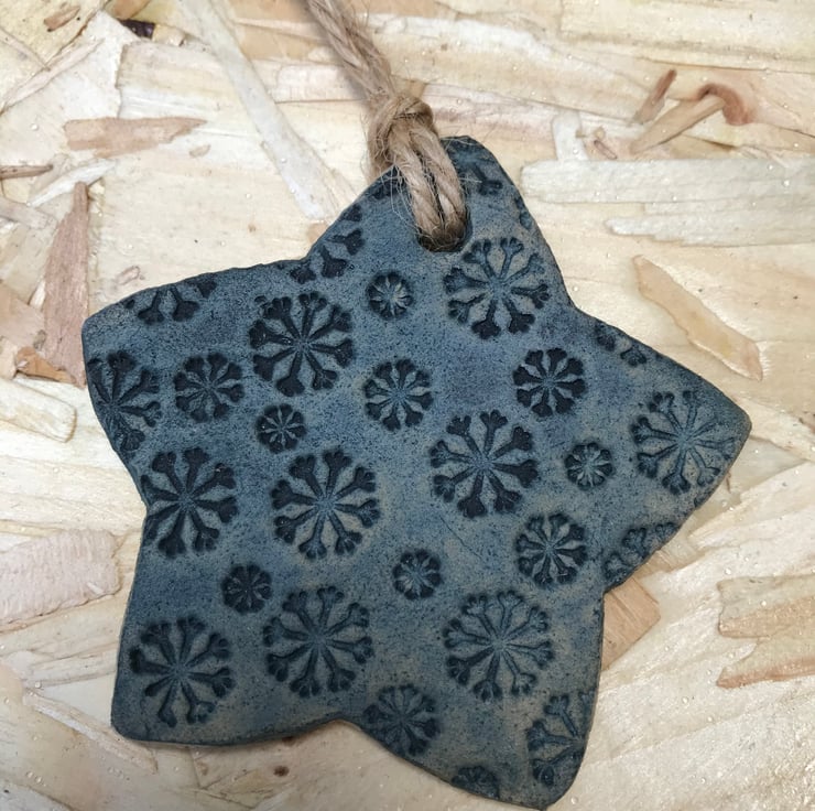 Blue oxide stoneware star with printed snowflake decoration. Approximately 8cm x 8cm. Perfect for inside or outside, frost proof.
