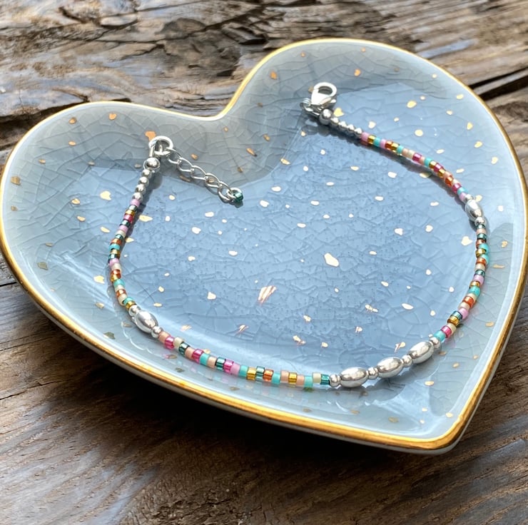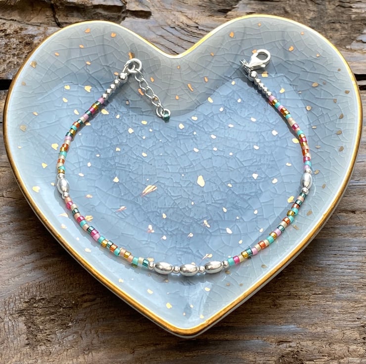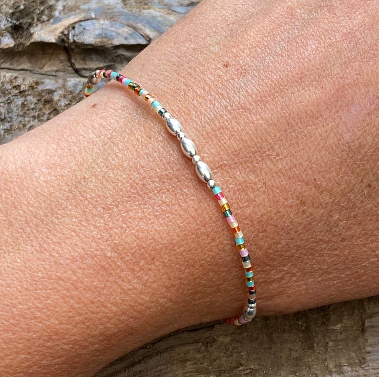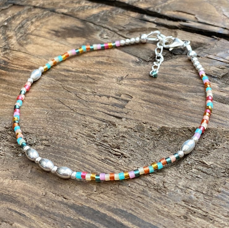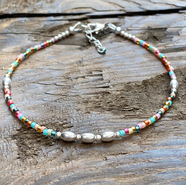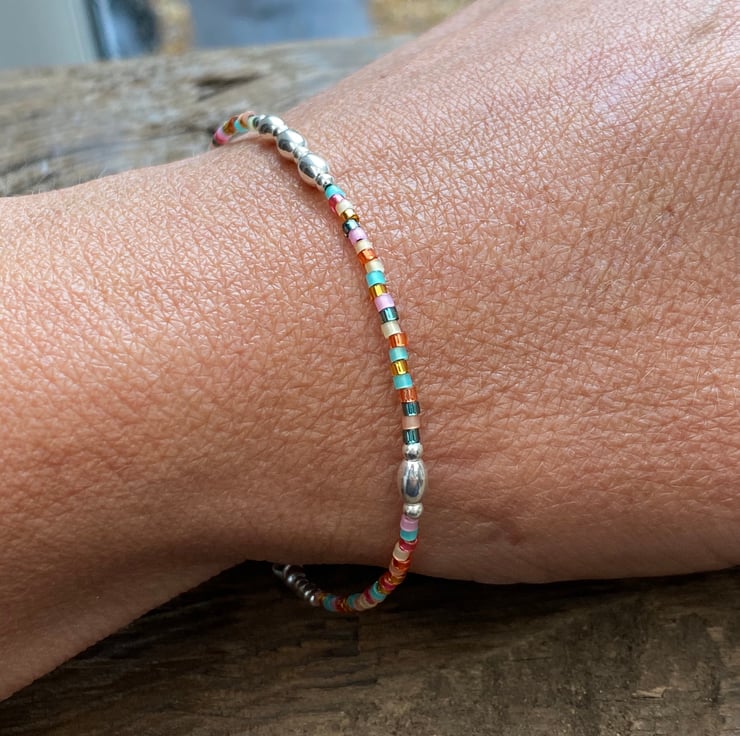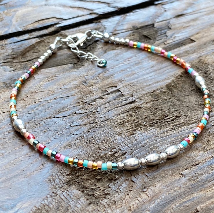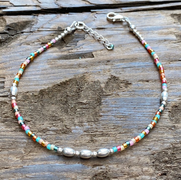 Made using tropical Miyuki Delica glass seed bead mix. Tropical is a pretty mix of turquoise, pink & orange. Separated with 5mm oval sterling silver beads and 2mm sterling silver beads. Hand threaded onto strong tiger tail wire and fastened with a lobster clasp.