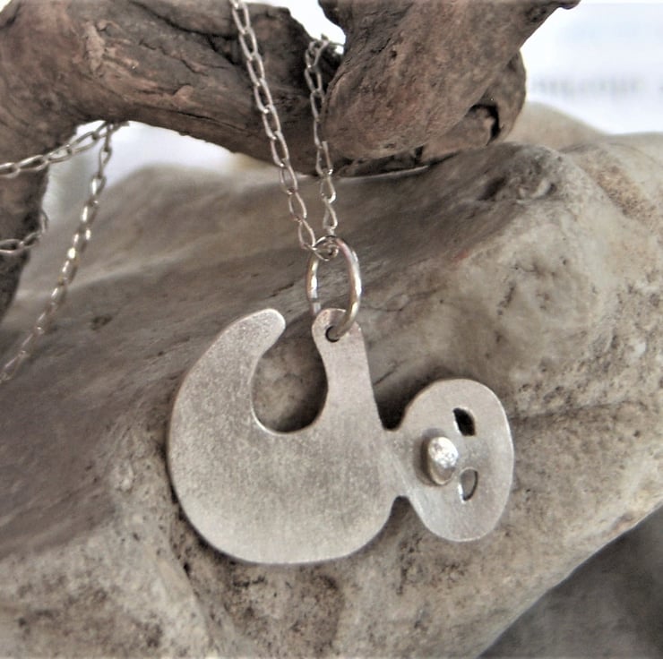 A sloth cut from sterling silver sheet and given frosted effect finish. Approximately 2 x 2.5 cms. Supplied with a sterling silver, 16 or 18 inch, please specify which you would like when ordering.