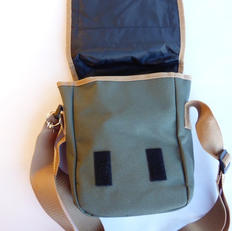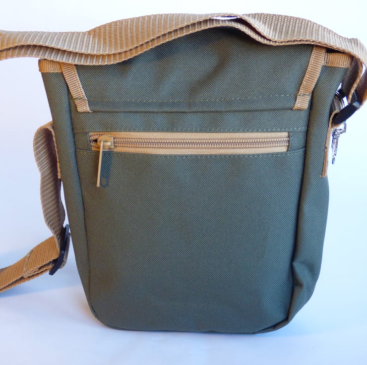To the front is a velcro fastening and to the rear is a zipped pocket.