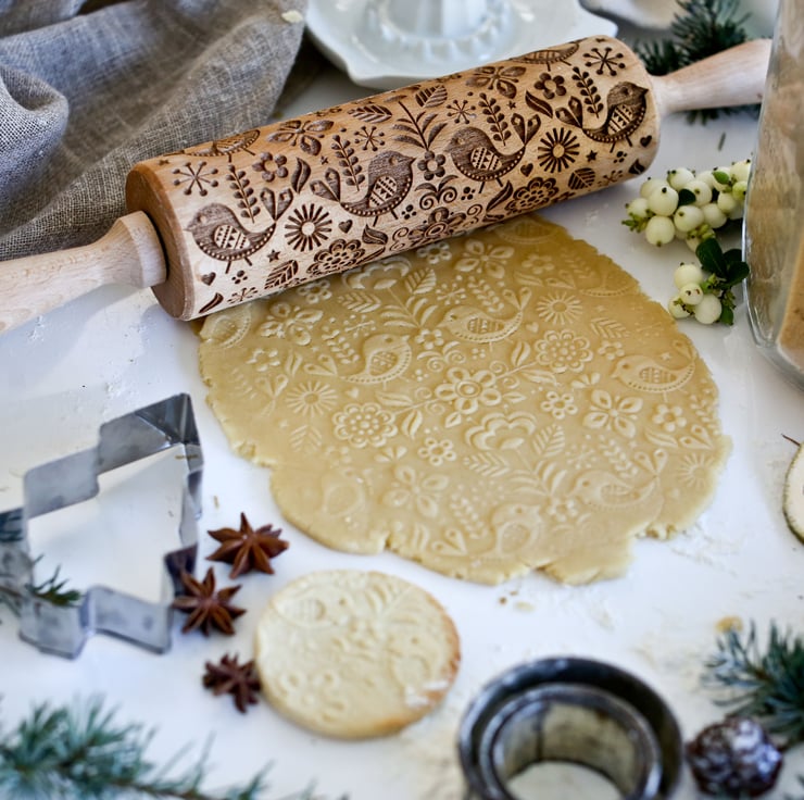 A Scandinavian inspired embossing rolling pin featuring birds and flowers repeat patterns. Looks great on cookies.