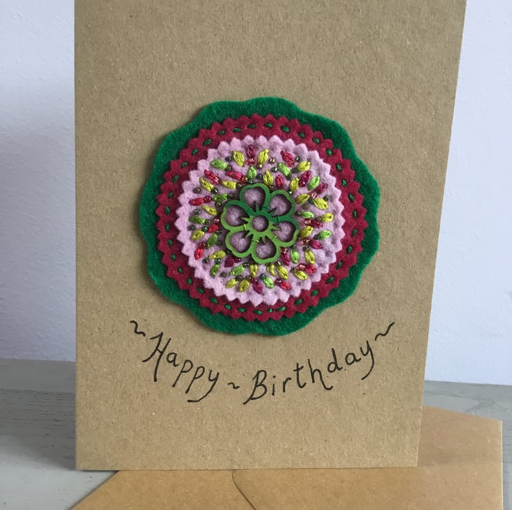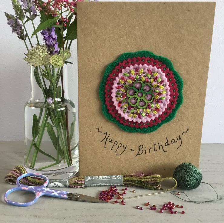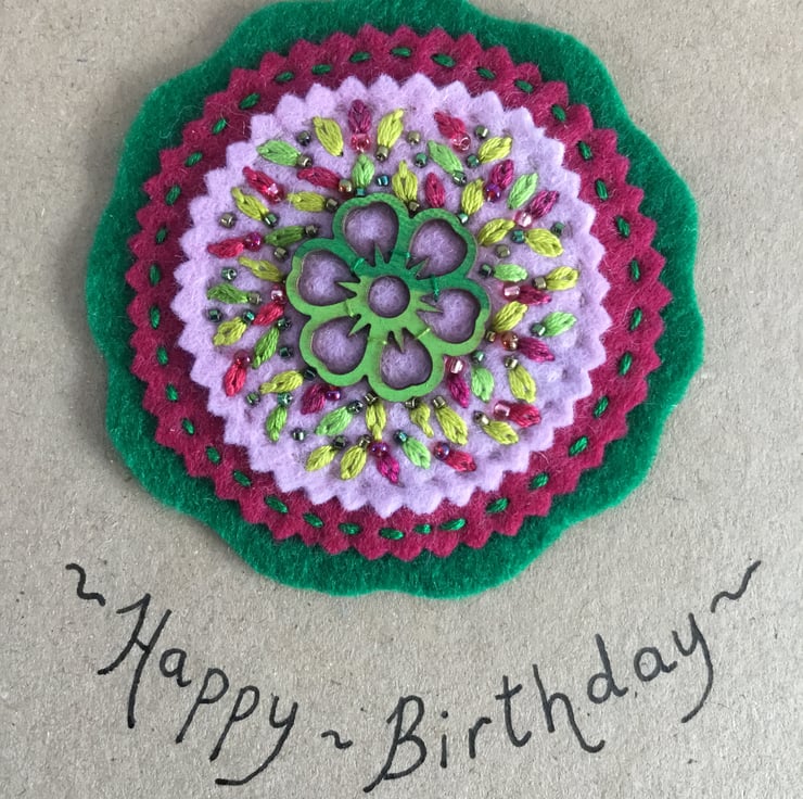 The hand embroidery on this birthday card represents a garden flower in a range of colourful pinks and greens. A green flower is the central motif, surrounded by hand embroidered petals dotted with small beads on a circular background of pink and green felt. The message ‘Happy Birthday’ is hand written below the embroidery. This birthday message can be continued inside the blank card.