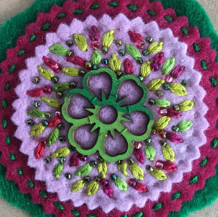 The pink flowers with their fresh green leaves in my garden, inspired the colours in this hand embroidery on this birthday card. The wooden green flower motif in the centre inspired the ‘lazy daisy’ embroidery stitches reaching out from it, like flower petals and dotted with beads. I created and embroidered this birthday card in my Sewing Room in Yorkshire looking out to my garden.