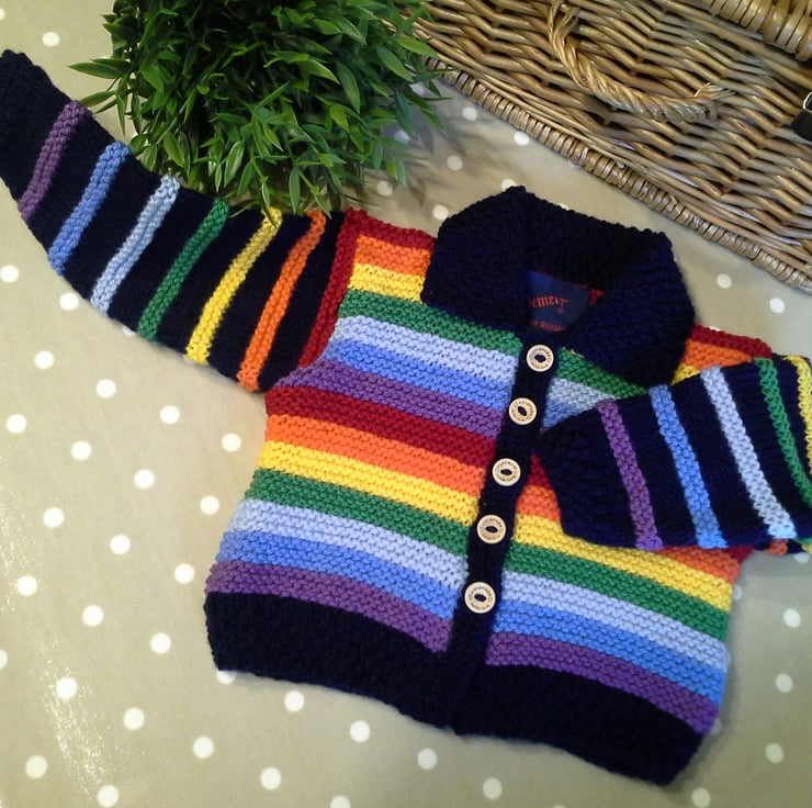 A lovely bright rainbow baby unisex jacket designed and hand crafted using quality branded machine washable acrylic yarns. The sleeves are extra long to gain further wear.