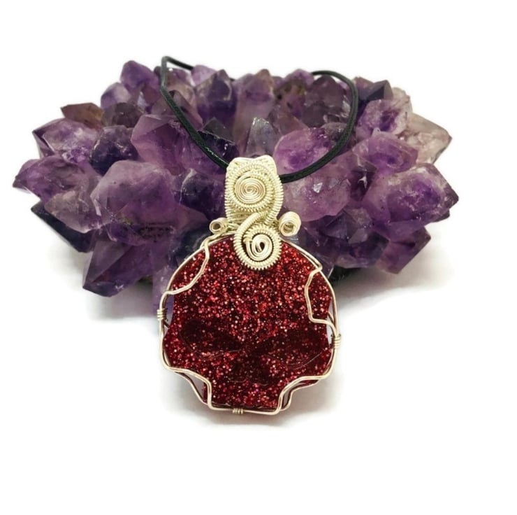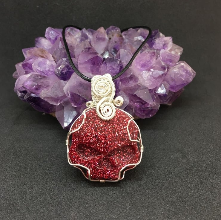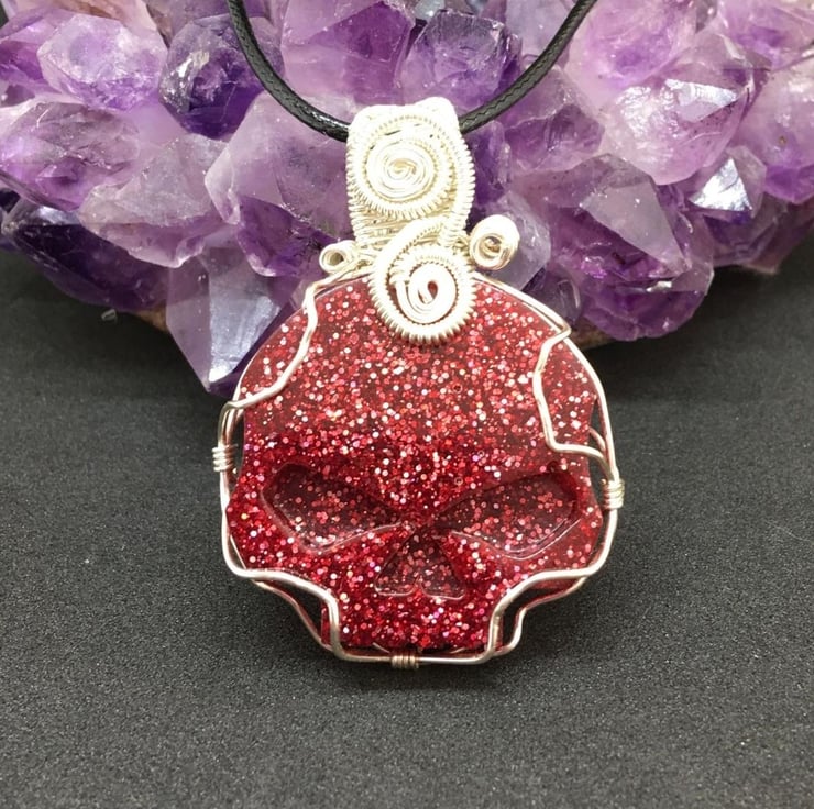 Red skull pendant wire wrapped with silver plated wire and supplied with a black cord chain. I have mixed gorgeous shimmery mica powders and glitter resin to create this fabulous skull pendant. I then wire wrapped the resin skull with silver plated wire to encase the pendant.