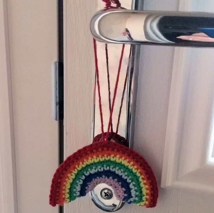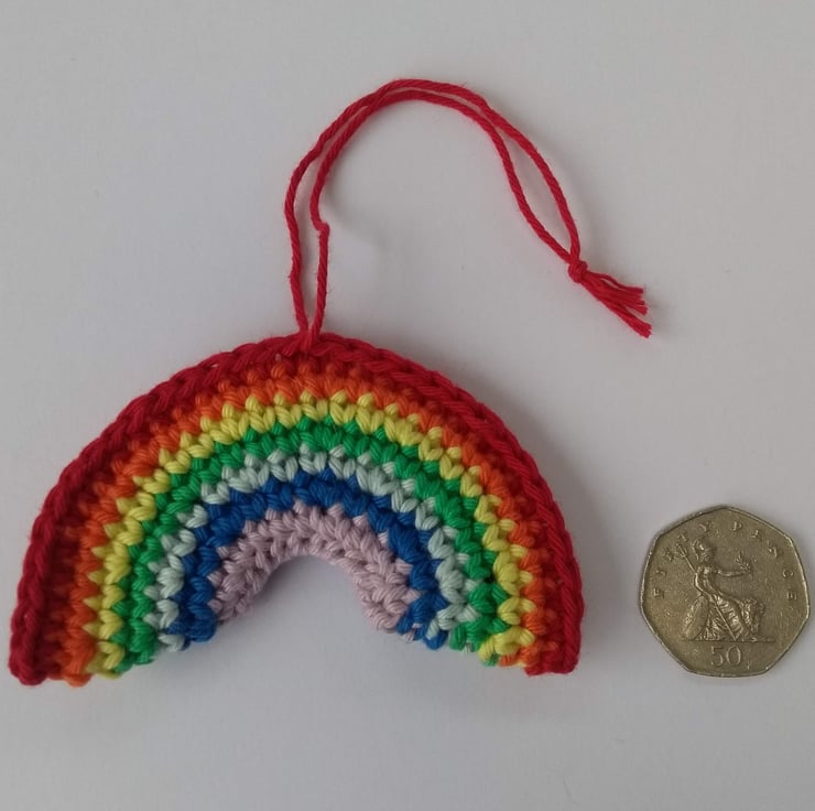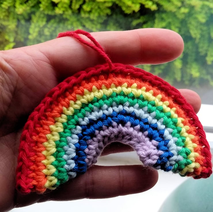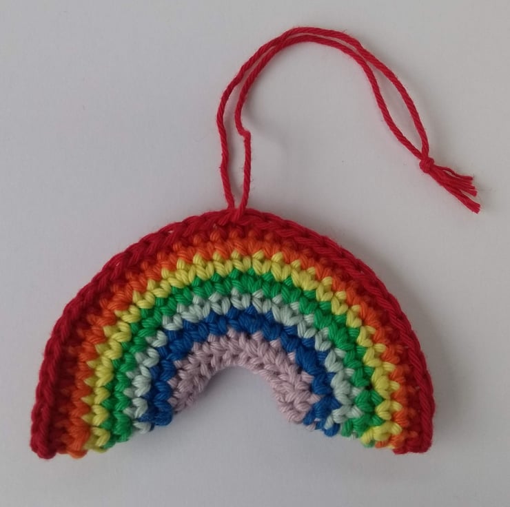 The double thickness makes the rainbow into a sturdy decoration and I have added a loop in red yarn so that it can be hung in a window, on a door handle, in your car, on a house plant or even be used as a Christmas tree decoration!