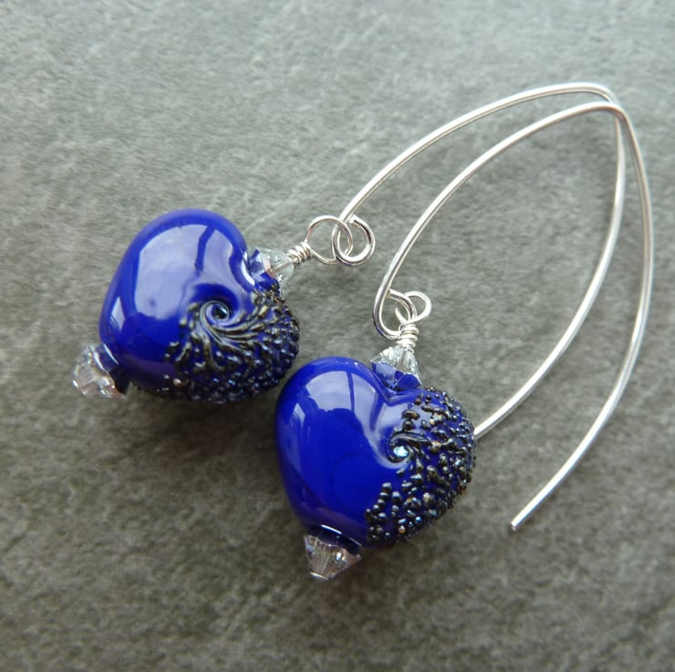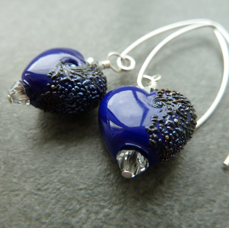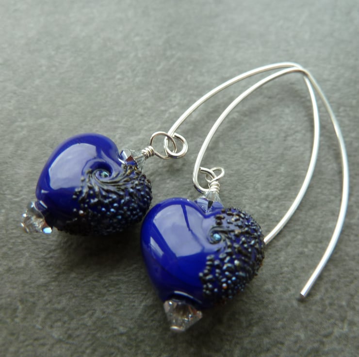 A pair of earrings made with handmade sterling silver ear wires and handmade lampwork glass beads.