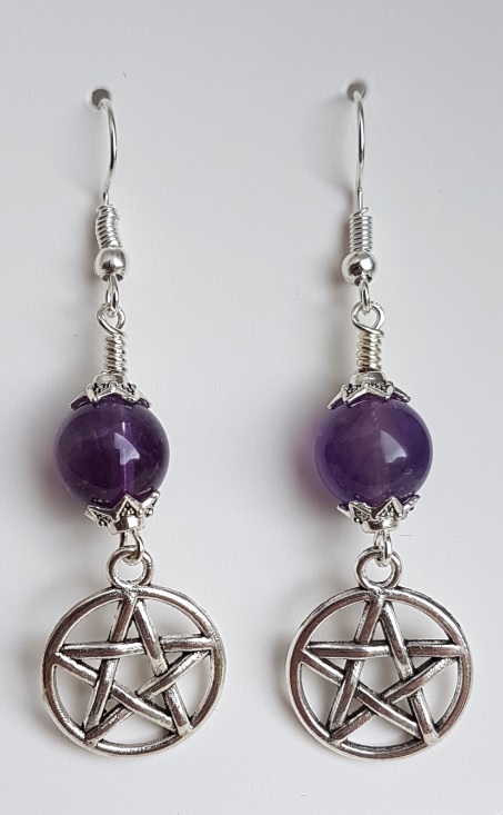 A beautiful pair, with large Amethyst round beads and gorgeous Pentacle charms. An unusual piece of jewellery and great as a gift.