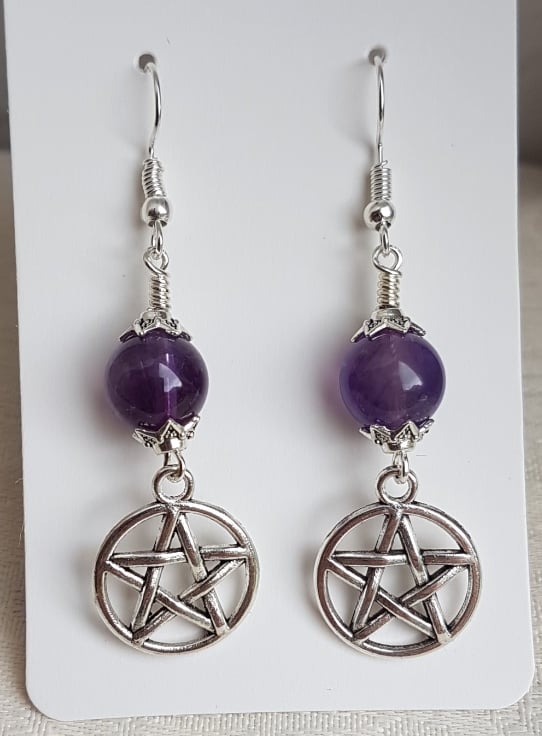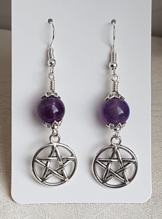 Earring length is approx 6cm long from the top of the ear wire to the bottom of the charms. Ear wires are Silver tone Stainless steel. If you require Sterling Silver ear wires (at a small additional charge) please go to the Choose Options box near the top right of the page. Pics 5 & 6 show styles available at the moment. Amethyst are 10mm round beads. Pentacle charms are Tibetan Silver.