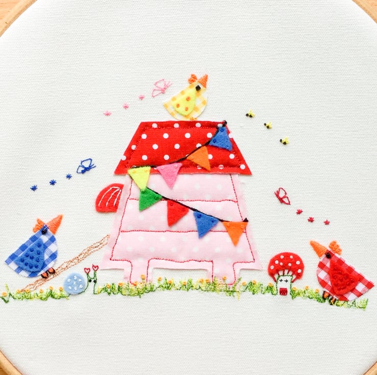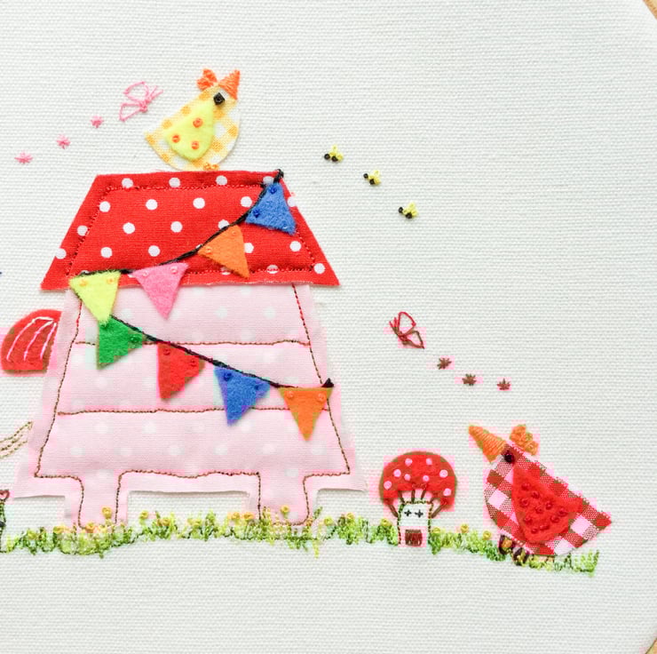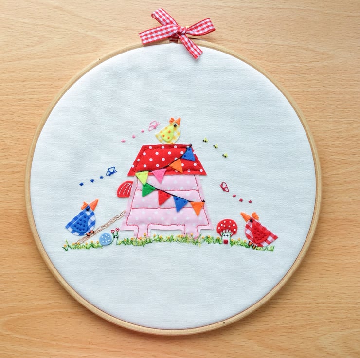 Hand and freemotion embroidery techniques have been used in this whimsical chicken design. Three little chickens are pictured around their very own dotty coop with cheerful felt bunting hung outside. A snail and toadstool keep the trio company, with hand stitched butterflies above.