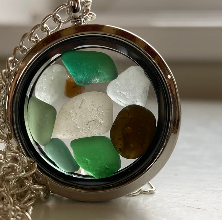 I had long wanted to go to collect seaglass from Seaham beaches. The glass that was collected was mostly very small pieces, too small to drill or use glue to attach bails. Not what I usually find and use. So I set out to source an affordable fillable locket to show off the glass. and this is one of the lockets made up. This locket has one of the two-tone pieces of glass, which is one of the reasons Seaham glass is so sought after.