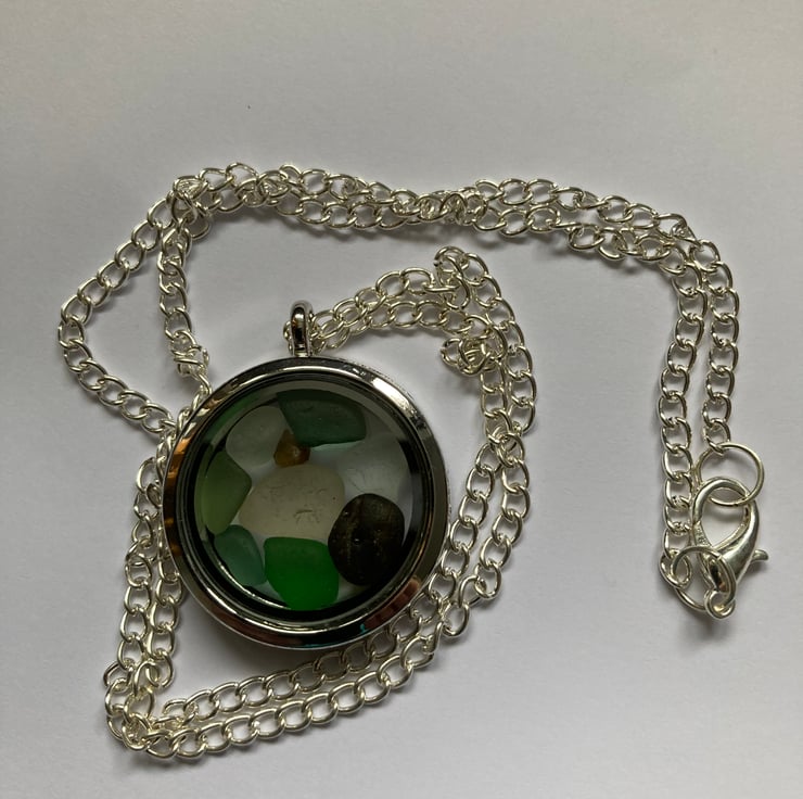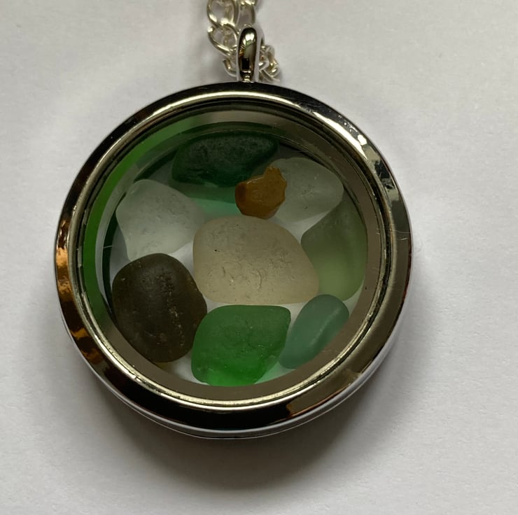 Tiny pieces of seaglass have been collected from Seaham beach (Durham coast, UK) and used to fill this 3cm diameter silver coloured, clear faced locket. The locket is attached to a 22inch medium weight silver plated chain, making it an ideal length to show off the colours within the locket. At the top of the locket is a piece of two colour, blue/green-white (clear) glass, one of the quirks of Seaham glass - possibly created from when the molten glass entered the sea. The locket is hinged on one side and closes with a magnetic catch.