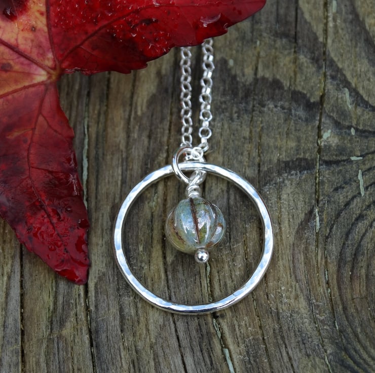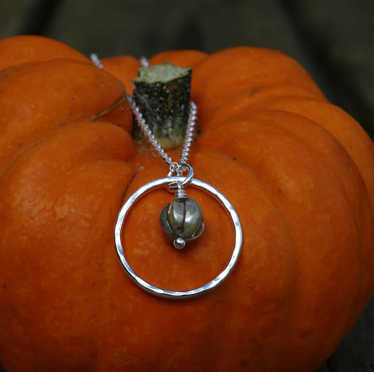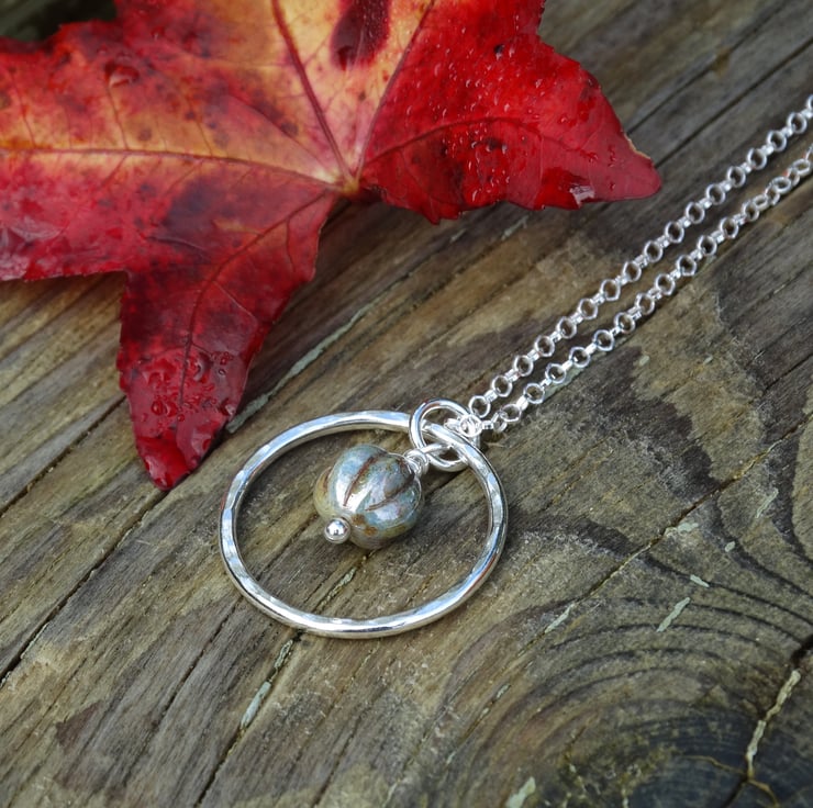 A pretty handmade sterling silver pendant featuring a little pumpkin shaped ceramic bead. The bead has a lovely pearlescent finish and its colours remind me of those bluish green Crown Prince squashes.
