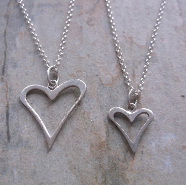 Sterling silver 925 heart silhouette pendant on sterling silver chain. One for mummy approx 16mm in drop on an 18 inch sterling silver chain and the one for the girls, 11mm heart on a 15 inch chain, You can ask for a different length of chain if required, Both pendants will come in their own gifts boxes tied with ribbon.