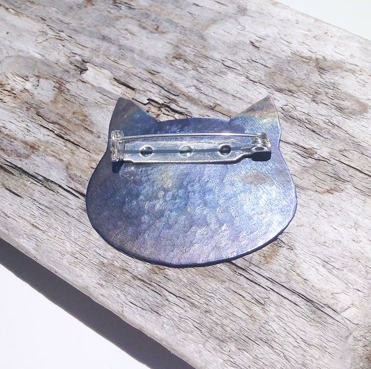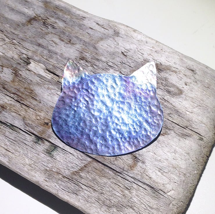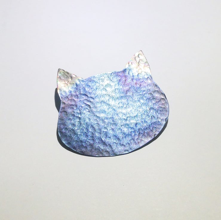It been hand sawed from titanium sheet which has been given a hammered finish and coloured. The brooch fastens with a silver plated bar brooch pin with a roll over safety catch which has been attached to the back.