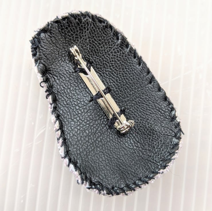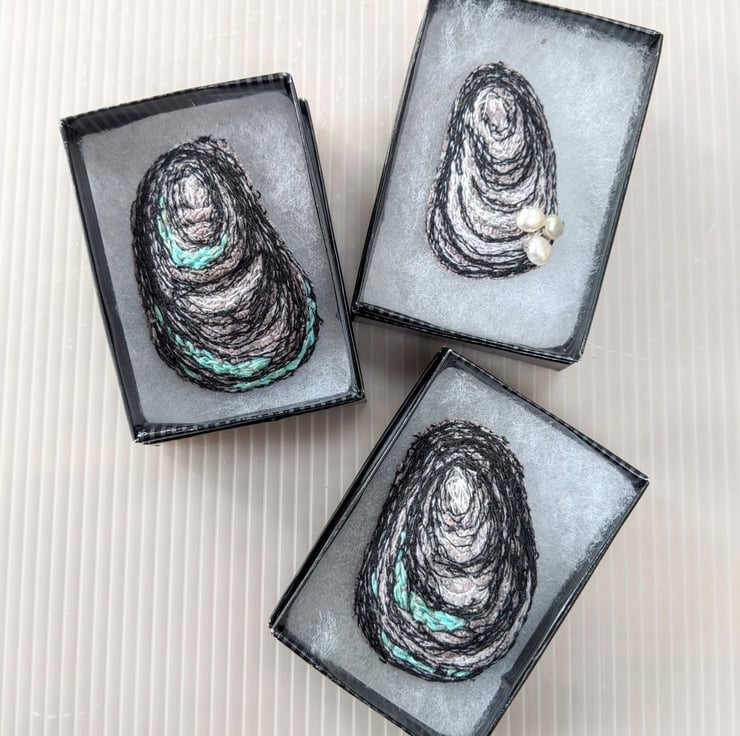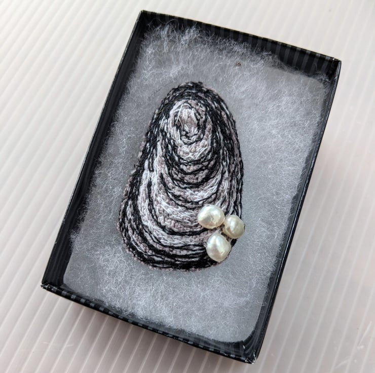Concentric stitching using free motion embroidery to mimic the markings found on shells gives the fabric the strength to form a 3D shell shape. Fresh water pearls represent the barnacles often found on mussel shells collected when beach-combing. This is kept in place by a leatherette backing with a commercial brooch back complete with a standard rolling safety clasp.