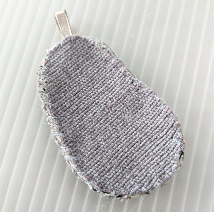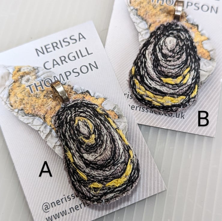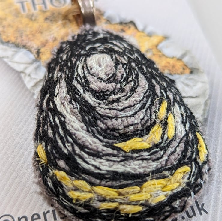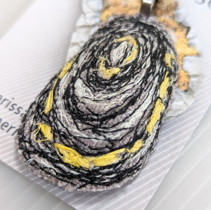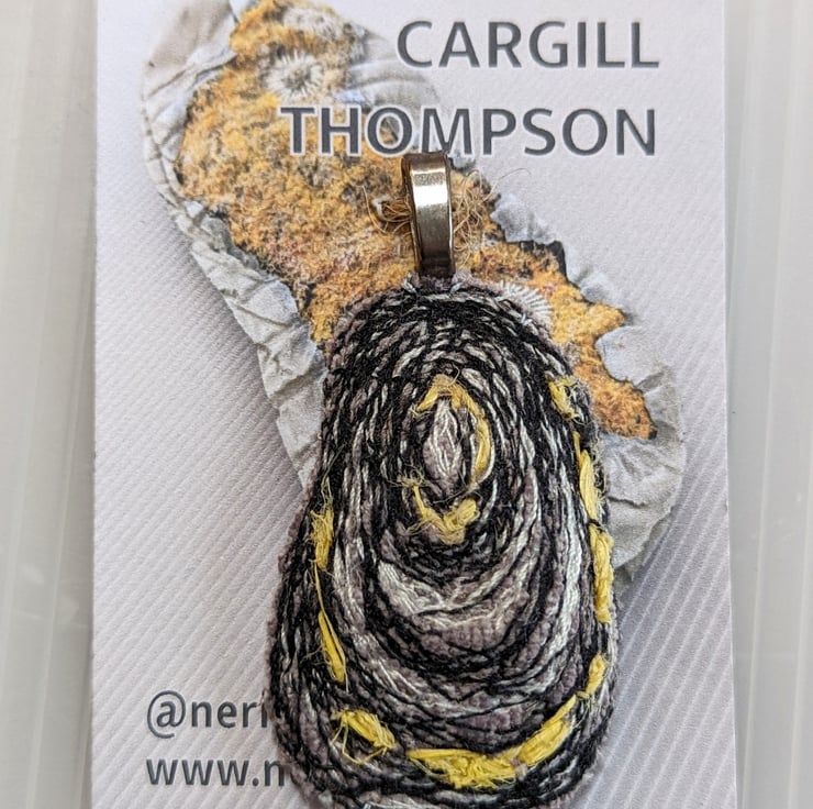 Concentric stitching using free motion embroidery to mimic the markings found on shells gives the fabric the strength to form a 3D shell shape. The colour pop detail has been added by hand using beach-combed fishing twine. This is kept in place by a velvet backing with a commercial clasp suitable for a chain, cord or ribbon.