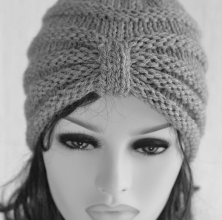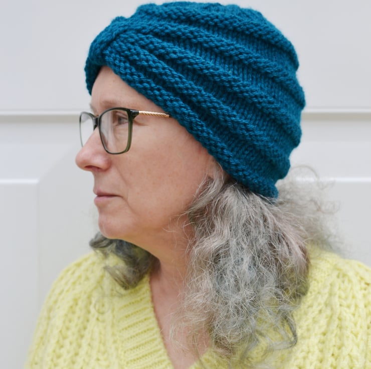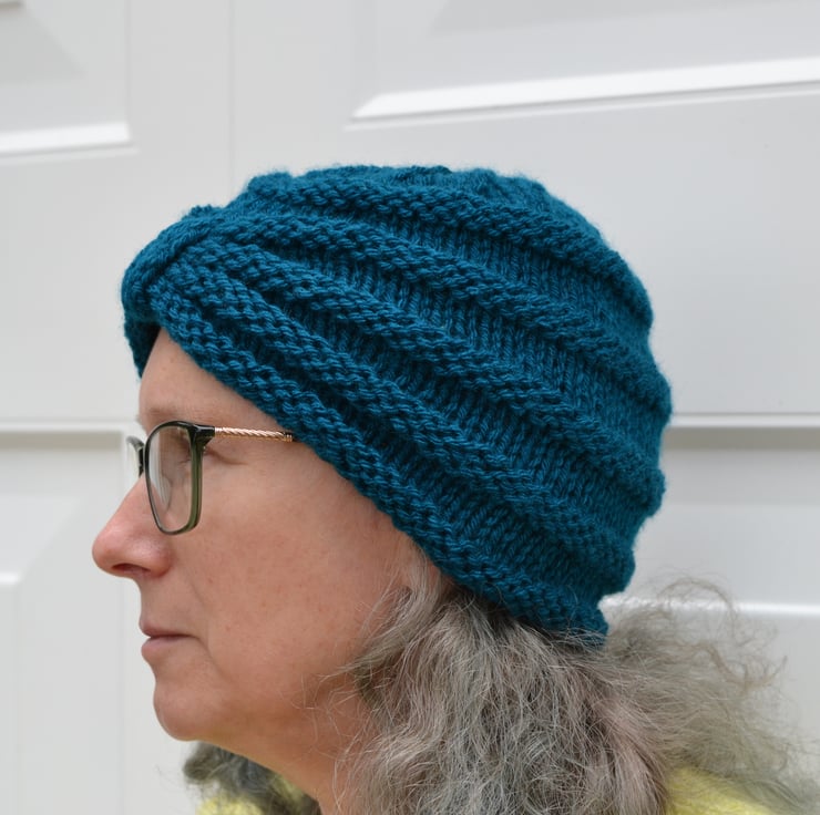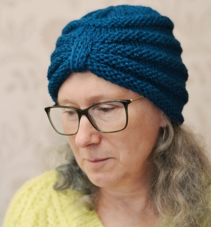 Lovely teal chunky knit turban style beanie hat. Knitted in 100% acrylic in one of my own patterns. Fits heads 21'' to 22''.