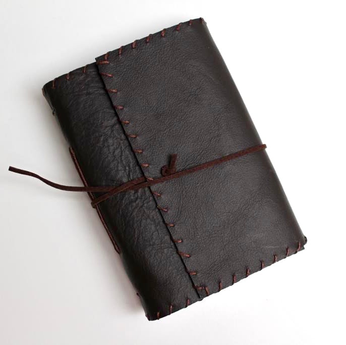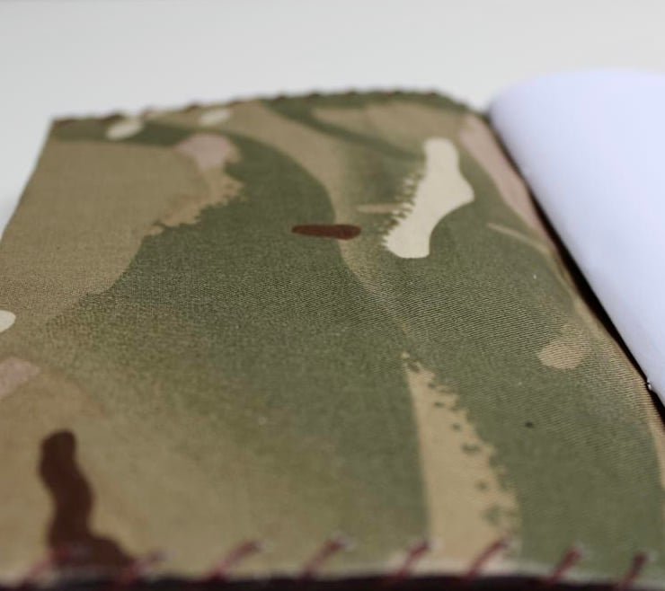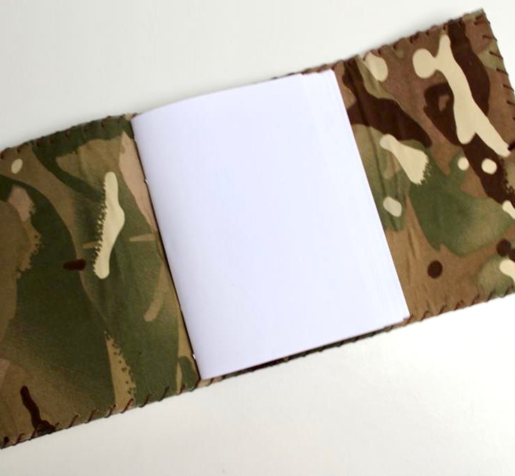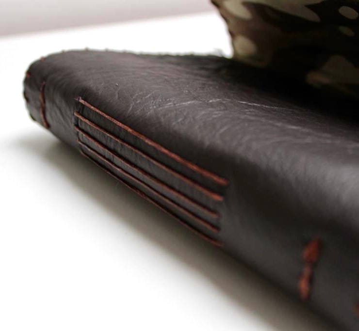 A dark brown thick, but very soft leather with a green camouflage pattern lining. The notebook is hand stitched around the edge with a dark brown thread and contains 200 blank sheets of plain paper which are then hand stitched to the leather in 5 signatures. The notebook is fastened with a dark brown leather cord tied loosely at the front.