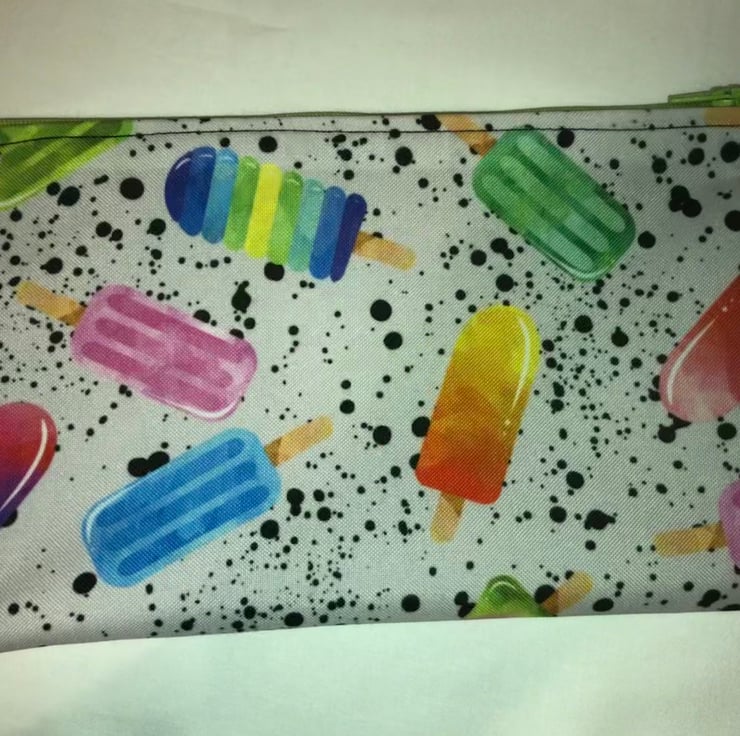 This listing is for 1 multi coloured lolly pop pencil case. It is made from a polyester water resistant fabric and has a green zip closure.