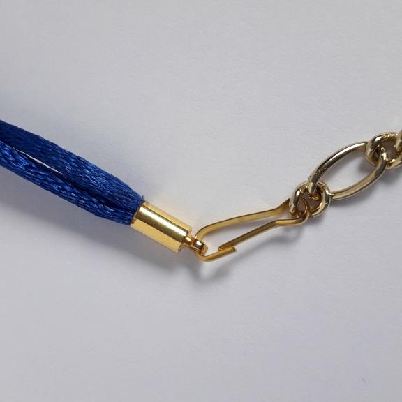 I have suspended the buckle from royal blue silky cord which is attached to a fancy chain (taken from a broken necklace) with hooks which will fasten together allowing the necklace to be worn short or long.