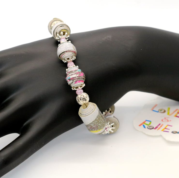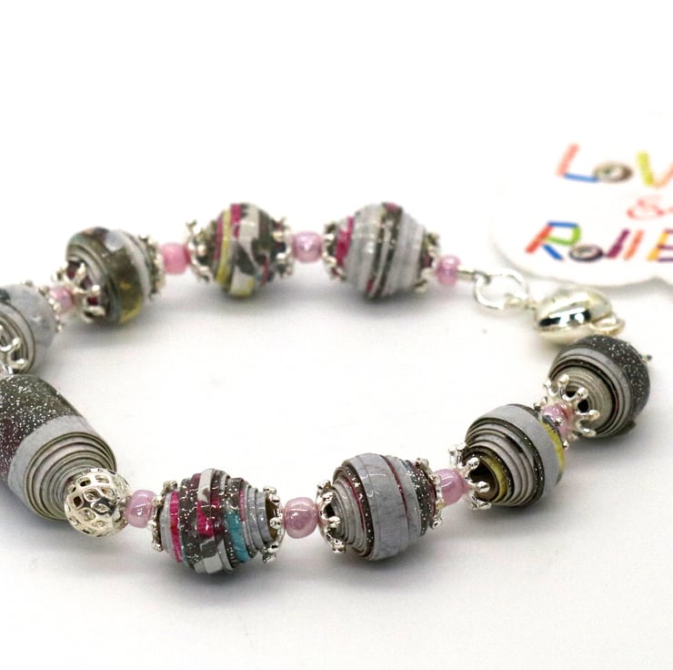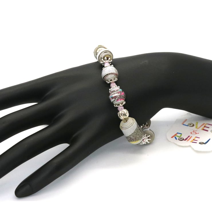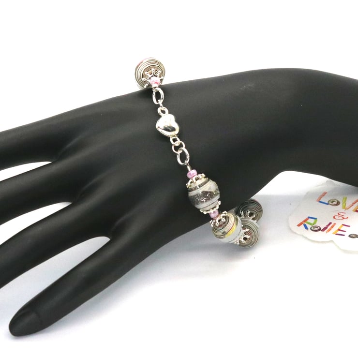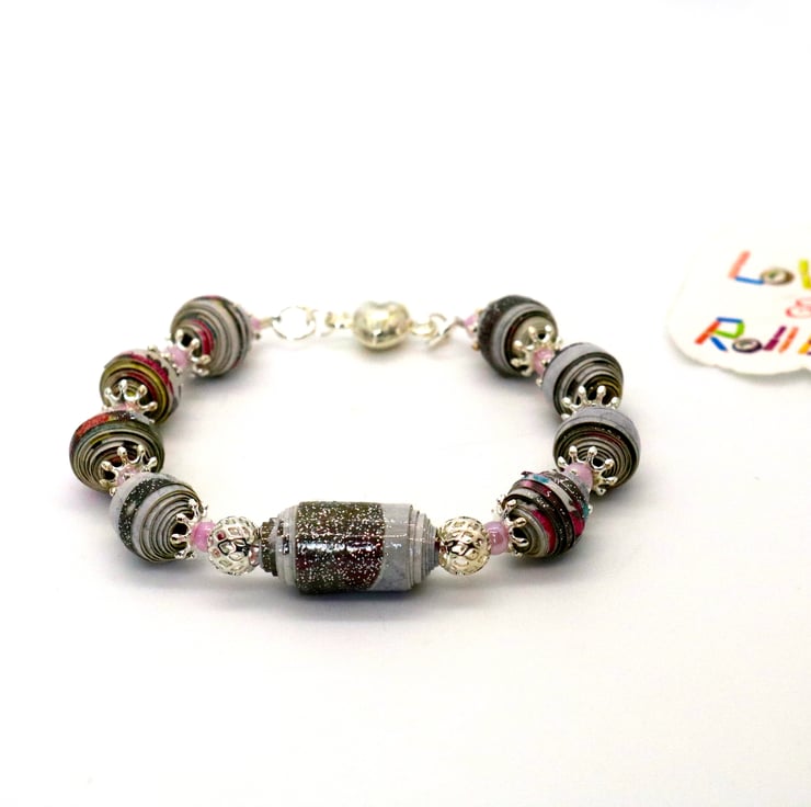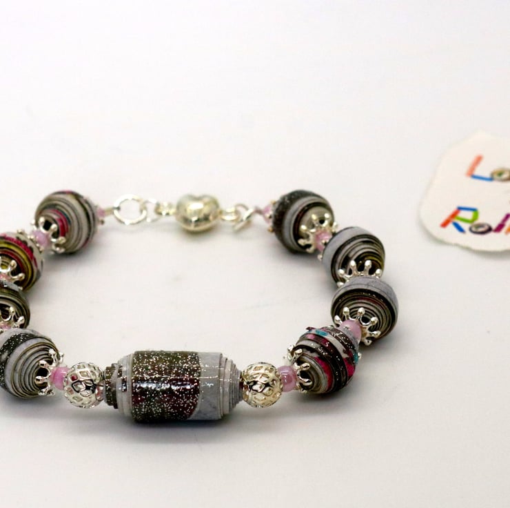 This bracelet sparkles and shines: It is made of left over cuts of wall paper with a flowery and silver sparkly pattern to it. The wall paper was cut into strips and handrolled into beads which were then varnished. The beads of different sizes were adorned with silvery findings then complemented with a shiny heart shaped magnetic clasp