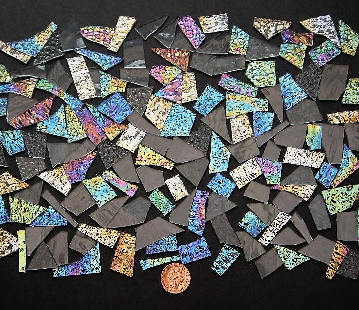 I have placed a 2 pence coin (bottom centre) to give you an idea of the glass sizes in proportion to the picture, also I have taken the pictures on a black paper background to show the effect of the iridescent glass.