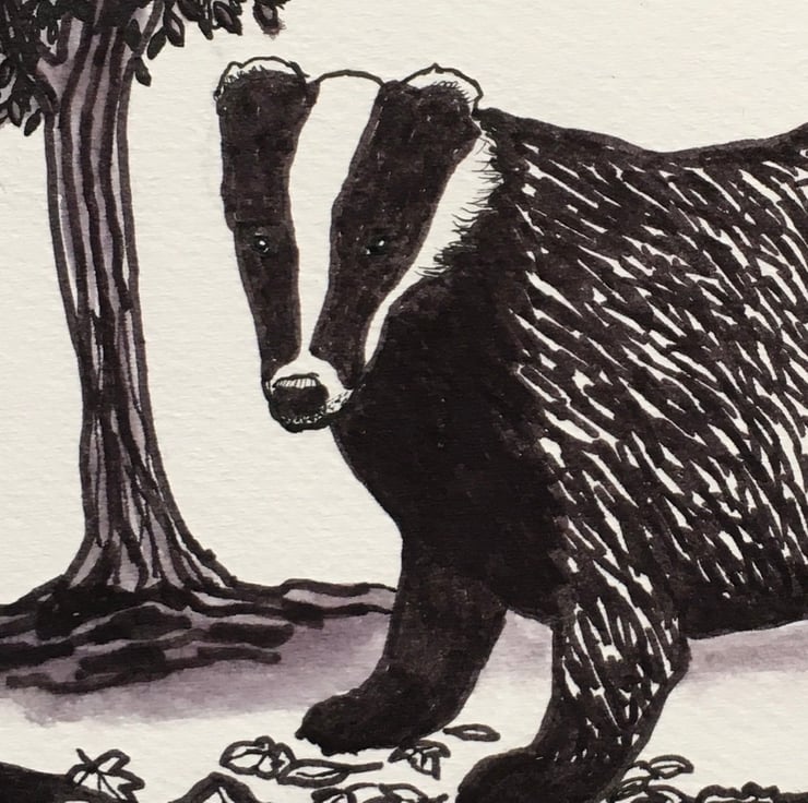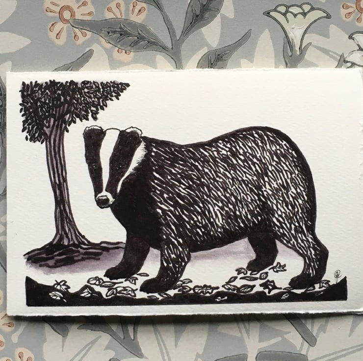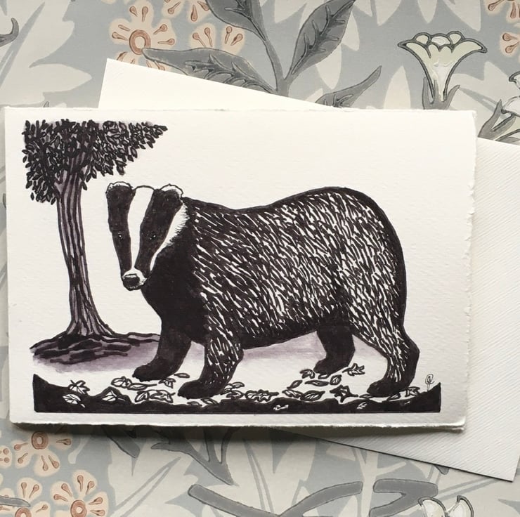 A quality watercolour card with a hand drawn ink badger in a woodland setting. This unique card measures 11 x 17 cms (4.5” x 6.5”) and will be supplied with an envelope in a cello bag for protection. This original art card is ideal for framing and will fit a shop bought frame of the same or similar size. Postage is free to UK destinations.