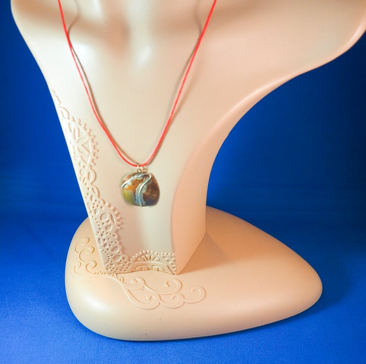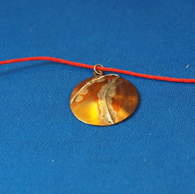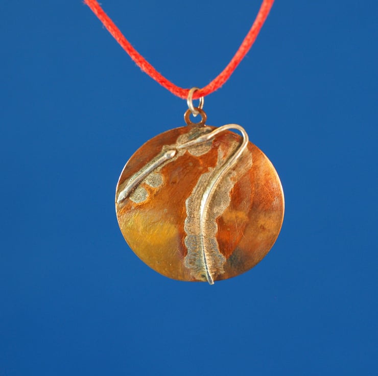 Copper circular pendant with silver fused to it. The pendant is approximately 2.5cm across and has a recurved flash of silver across it. It has been slightly reheated after cleaning to give a multicoloured patina on the copper. The silver still shows itself to be wire but has pools of melted silver around it, and has fractured into beads in places. I call it Trajectory because it makes me think of a spaceship flying over the surface of a planet, leaving plumes behind it. The circle is domed slightly to give it a more interesting shape. The pendant has a small pierced tag at the top and a jump ring is attached to this,Silver, it hangs from a fine, red cotton cord which is adjustable for length by means of two sliding knots, maximum length approximately 65cms.
