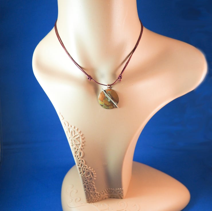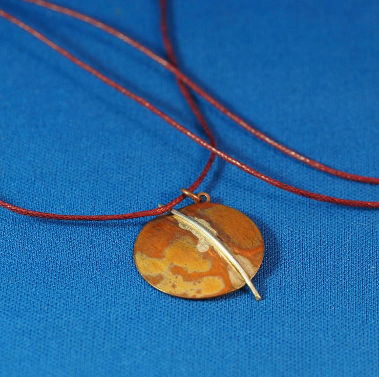A copper pendant with a line of silver fused to it at an oblique angle. After fusing, the pendant is cleaned and then re-heated to form a patina on the copper. This time the pattern reminded me of gas giant planets. The silver line has pools of melted silver along it's length adding to the storm cloud effect. The pendant measures approximately 2.5 cm across with the silver wire extending a little beyond the edge at each end. The circular pendant has a pierced tag at the top and a copper jump ring is attached to this and hangs from a fine deep red cotton cord which is adjustable for length by means of two sliding knots, maximum length approximately 65cm.
