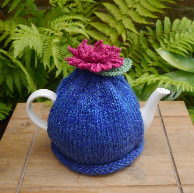 This lovely deep blue yarn has blue glitter yarn running through it which catches the light. It is a lovely soft chunky yarn to keep your tea warm in the teapot. The blue base is hand knitted.