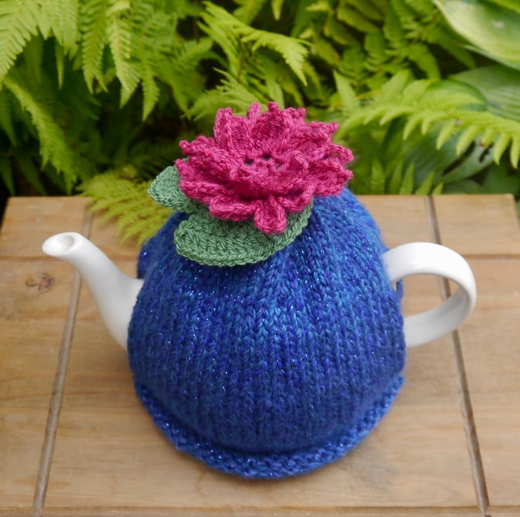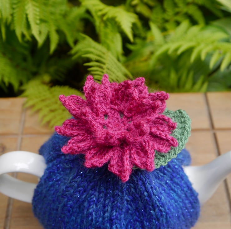 When I saw this gorgeous sparkly blue yarn I just knew that it had to represent water. I decided to design this tea cosy with a crochet green lily pad and bright pink flower.
