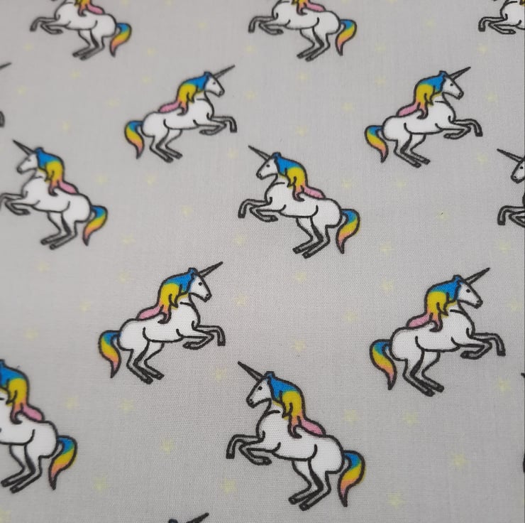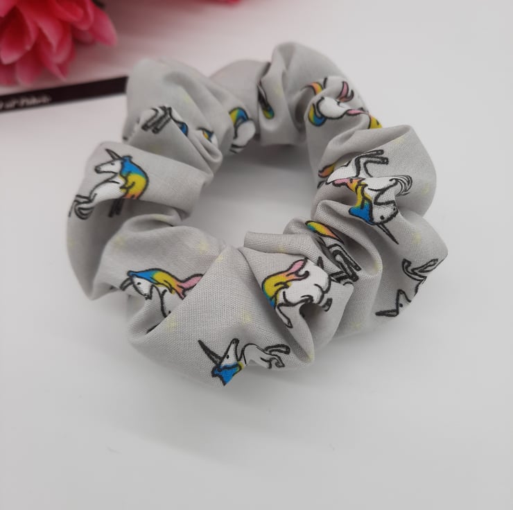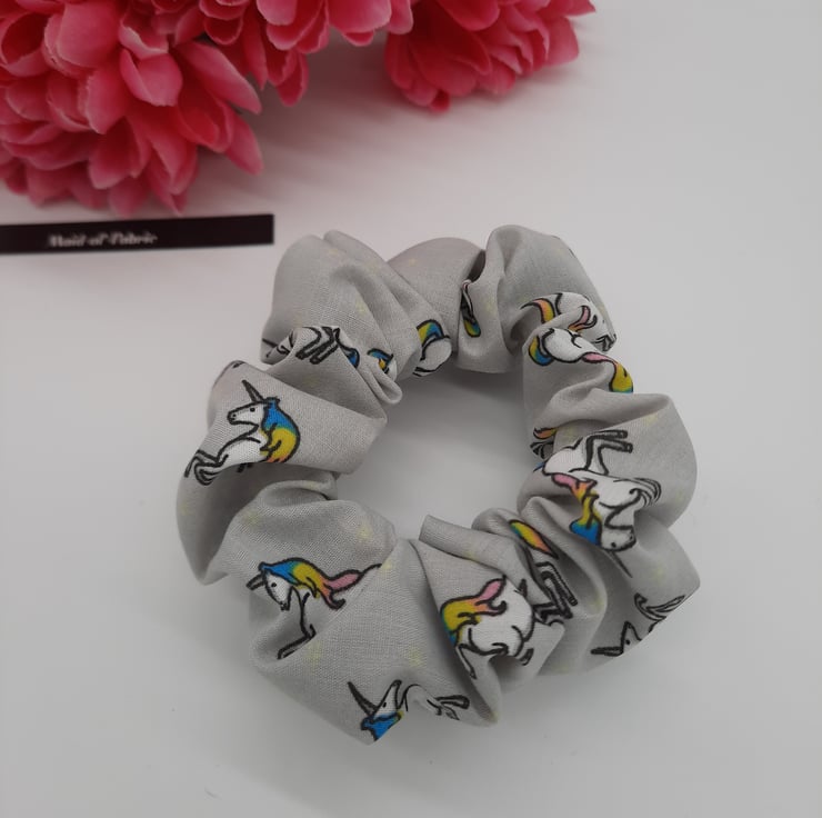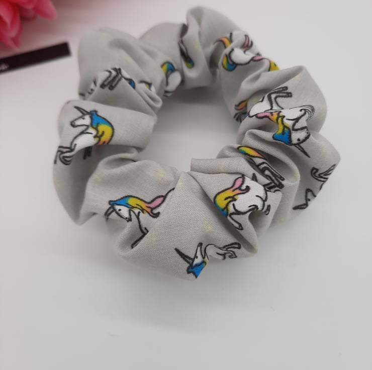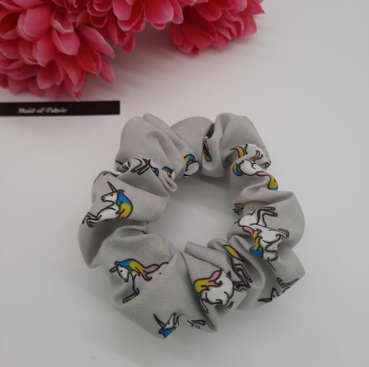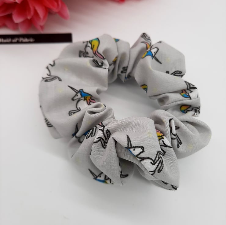 Hair scrunchie made using a light grey unicorn fabric and elastic.