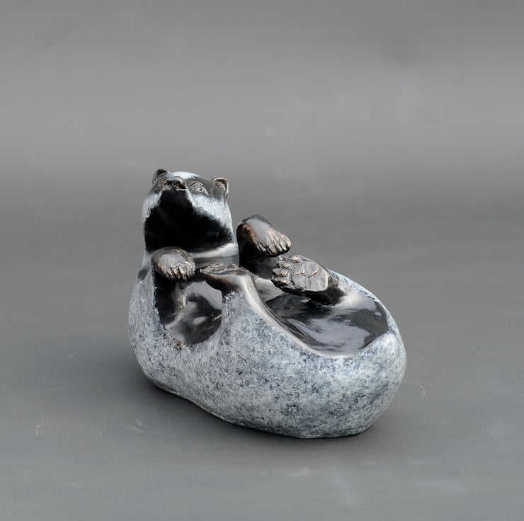 A small study of a Badger rolling, cast in bronze resin and mottled patina applied.