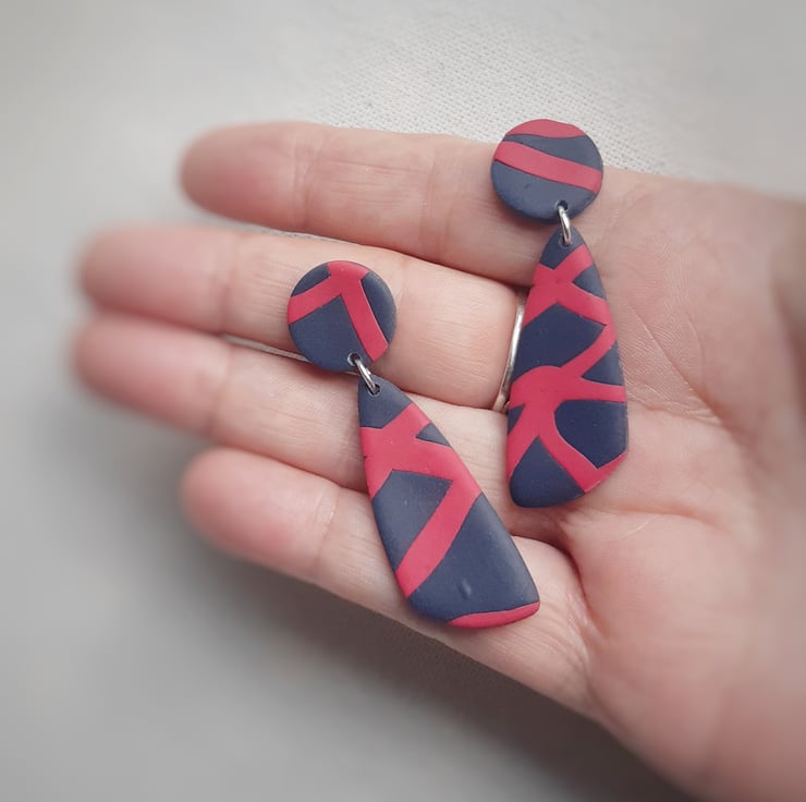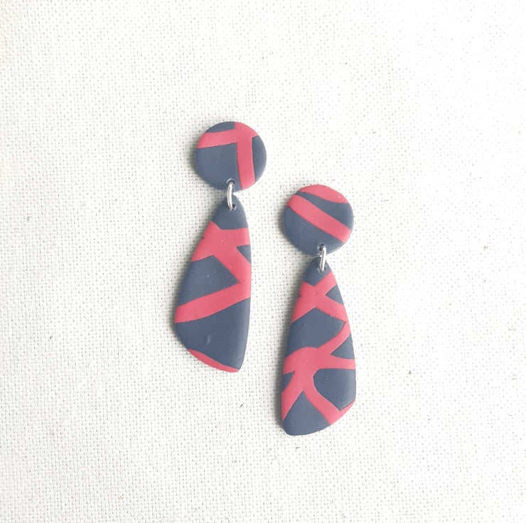 Contemporary navy blue pebble earrings with a pink criss cross design. Hand made from polymer clay, these one of a kind elegant dangles would compliment both casual and dressed up styles.