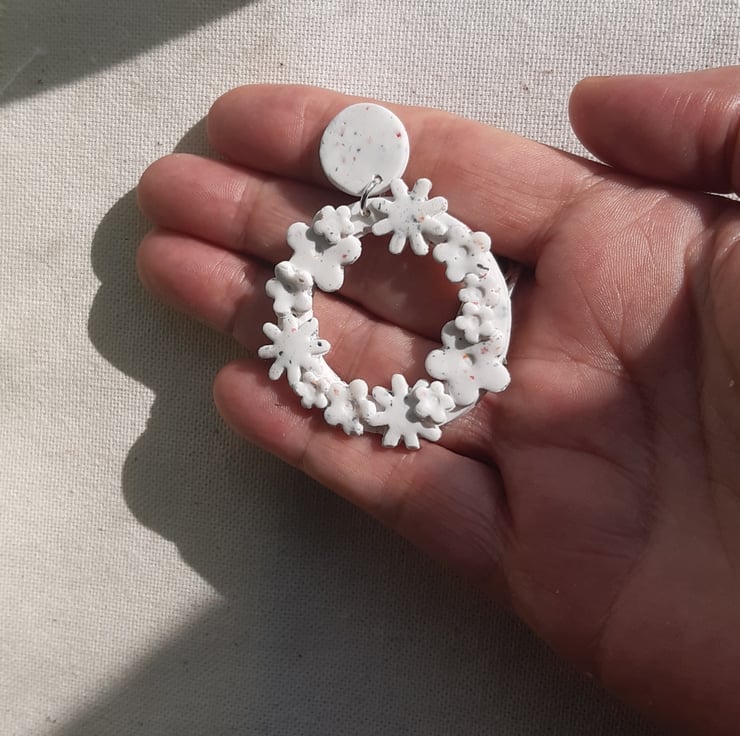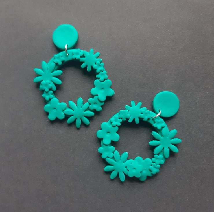 Handmade polymer clay earrings from an original design. Turquoise flowers formed into hoop earrings, make a statement all year round with these floral garlands for your lobes! They would also make a lovely Christmas gift as they resemble wreaths. Silver plated nickel and lead safe stud post for pierced ears only.