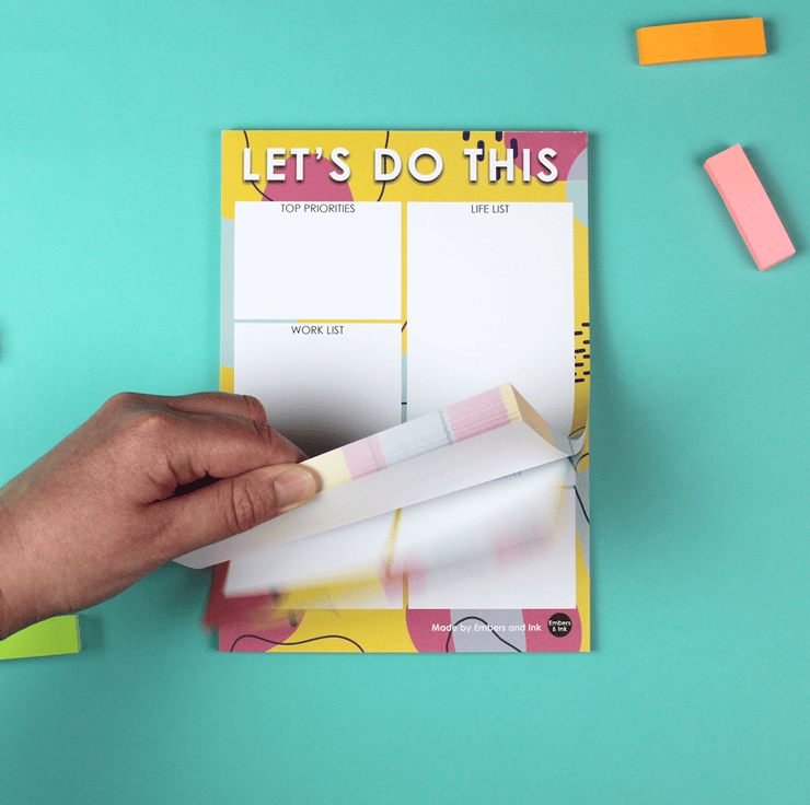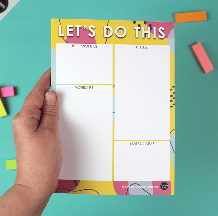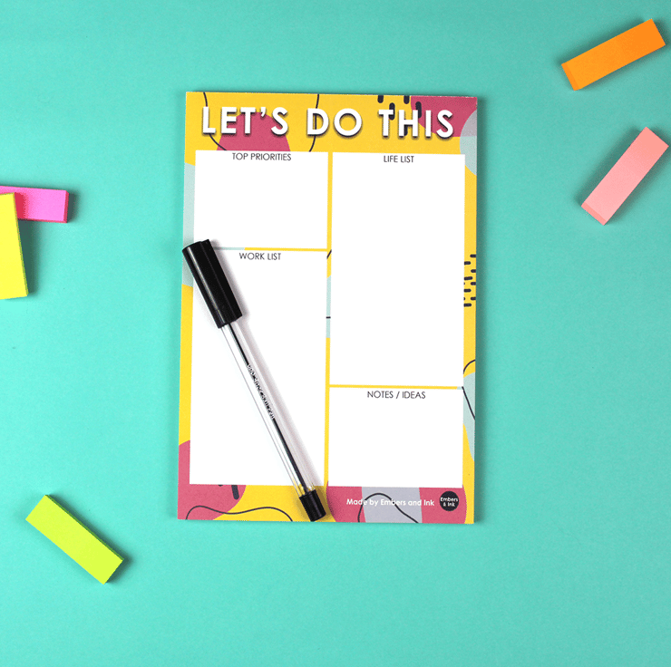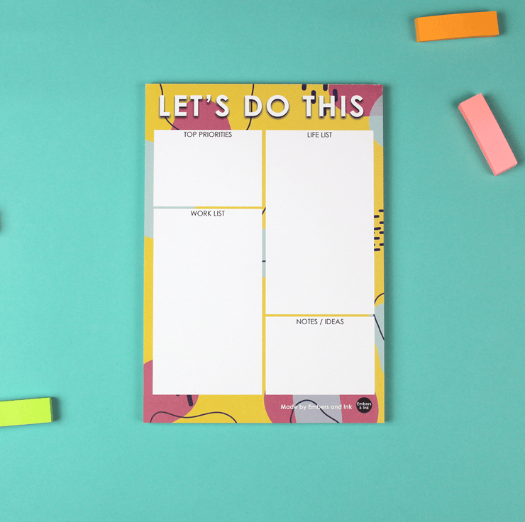 This bright and funky A5 notepad bearing the motivational phrase LET'S DO THIS will help to keep you organised and on track. To-do lists don't need to be boring: that's why I've cheered them up with this funky, bright and happy pattern. It's enough to make you want to pick up a pen and start sorting your life out straight away!