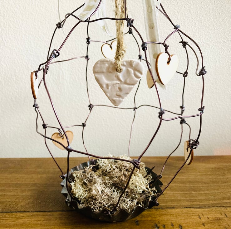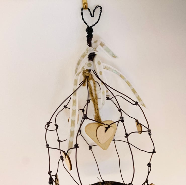 This wire bird cage is made by hand using a brown wire. It has a beautiful handmade ceramic heart hung from the tip of the bird cage.