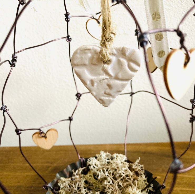The ceramic heart is made from stoneware clay and delicately glazed in a pure white colour. I have attached a sweet polka dot ribbon at the top of the bird cage. It also has a number is tiny wooden love hearts strung onto the wire bird cage.