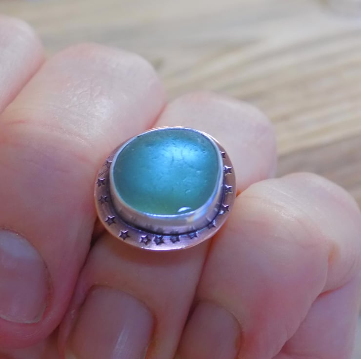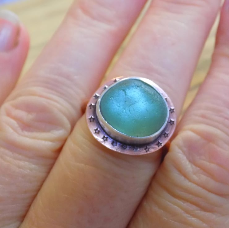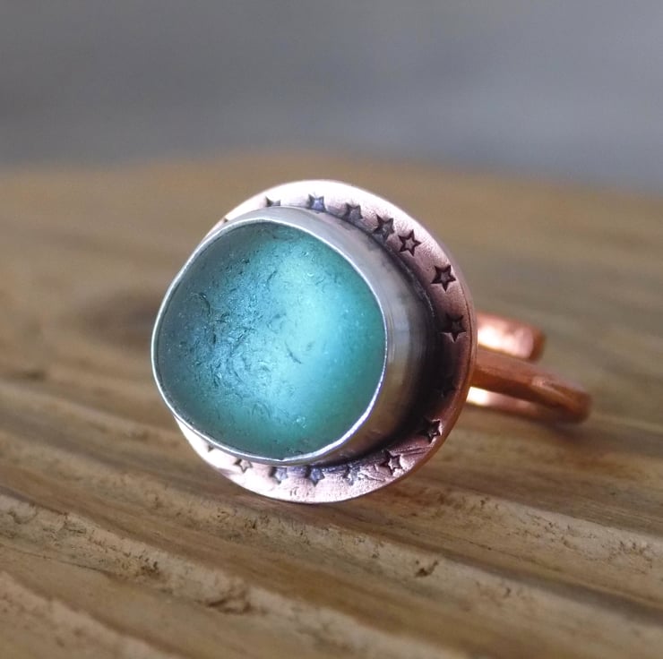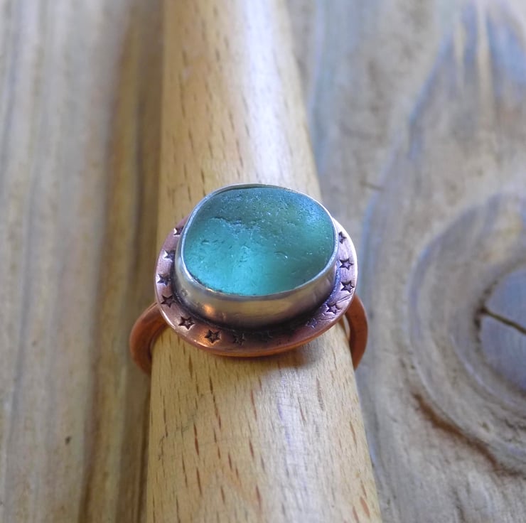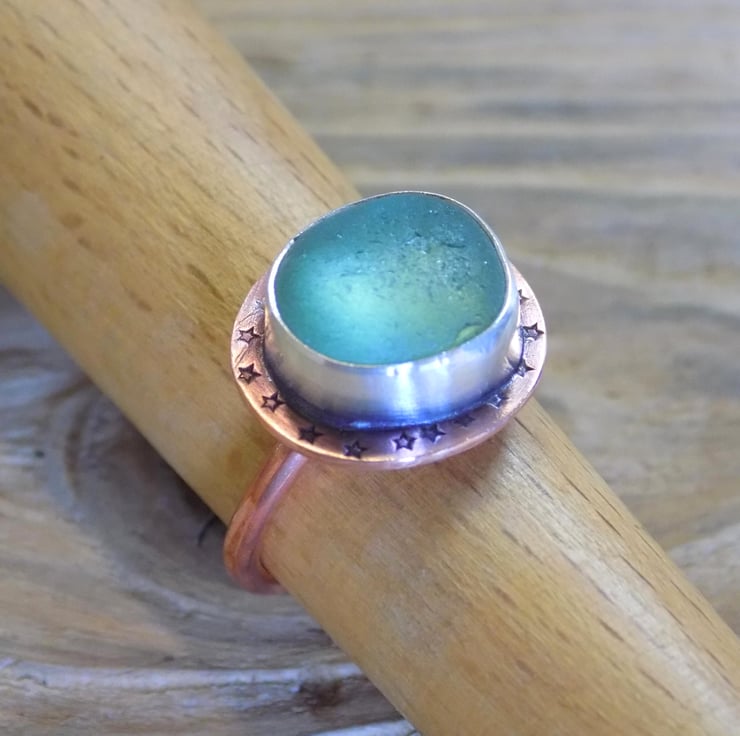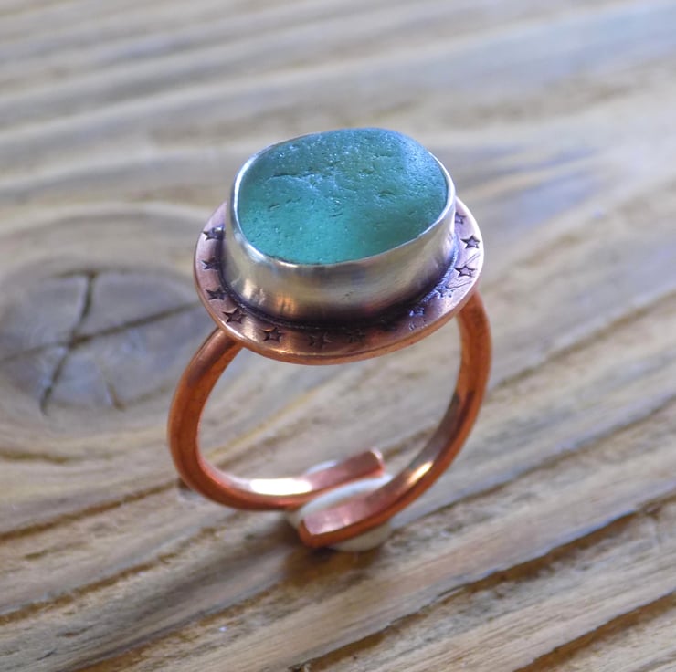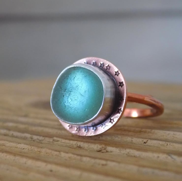 A unique and distinctive ring made from copper and silver. A lovely greeny blue piece of sea glass has been set in silver, backed with copper and sits atop a 2mm thick copper wraparound band. Its been given a slightly aged look which picks out the tiny stamped stars around the edge of the ring. It slightly resembles a medieval jewelled ring but with sea glass !