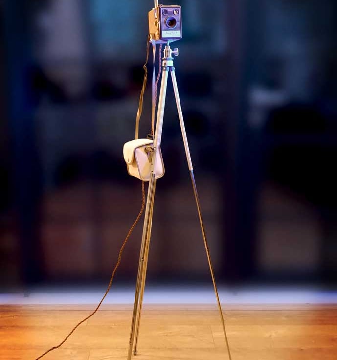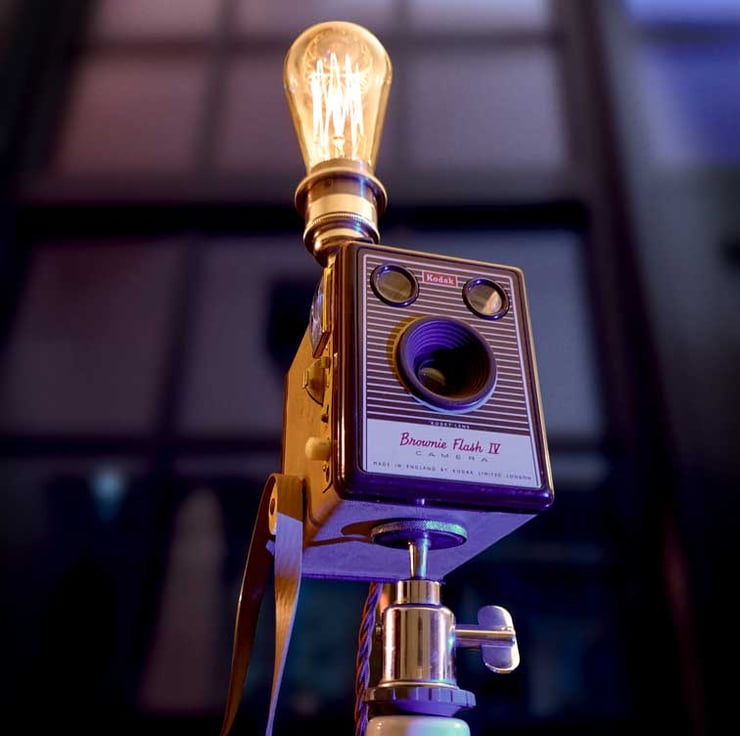 This vintage 1950's Kodak Brownie Flash IV camera has been beautifully upcycled into a striking and stylish floor lamp, complete with it's original camera case. The lamp has a vintage telescopic tripod with extending legs, and would look great as a statement piece in a livingroom, bedroom, office, bar, restaurant, or any other area.