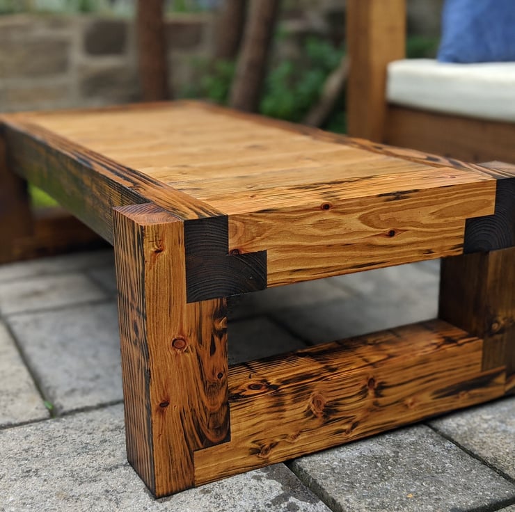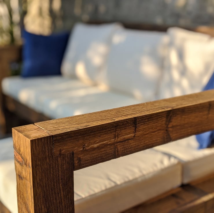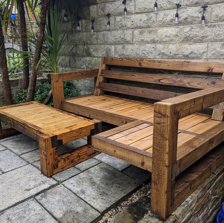 The Sofa is a Handmade and rustic corner Sofa built from Pressure Treated Timber that is 100mm Thick. This is an incredibly Strong and Industrial Design. Designed using a series of cantilevers and rebate joints that uses the strength of the wood itself to provide rigidity, this sofa even has a "floating" section that can support a fully grown adult. There are NO visible screws for a simplistic and Minimalist effect.
